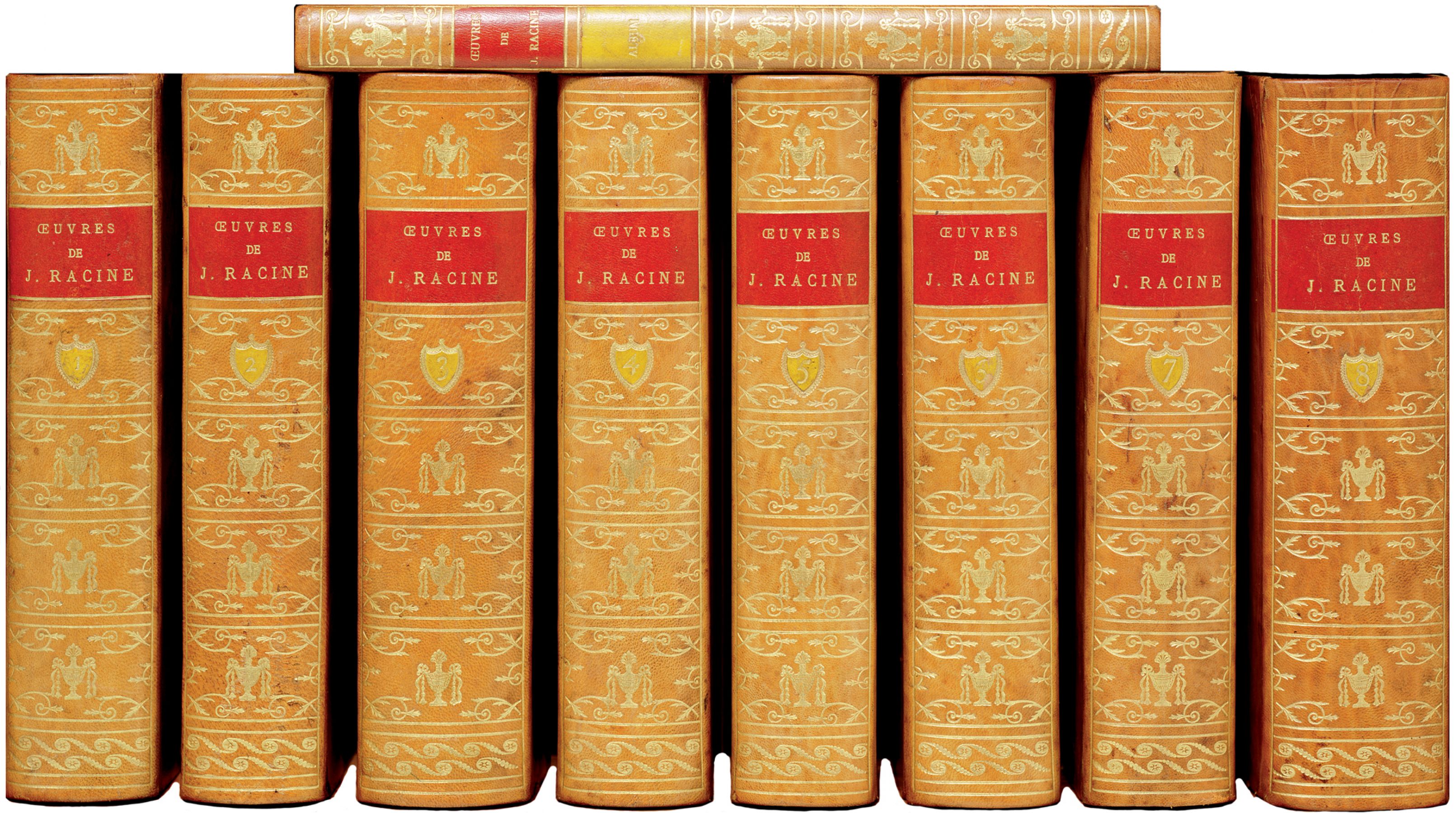RACINE Jean. Œuvres. Paris, Hachette, 1885-1911. 8 volumes in-8 [222 x 138 mm], et un album in-4 [264 x 175 mm], demi-veau fauve orné et doré, dos lisses, couvertures. Nouvelle édition revue et augmentée de variantes, notices, d’un lexique, etc. par Paul Mesnard. Seconde édition des Œuvres complètes dans la célèbre série «Des Grands Ecrivains de la France», bien complète de l’Atlas. Bel exemplaire.
