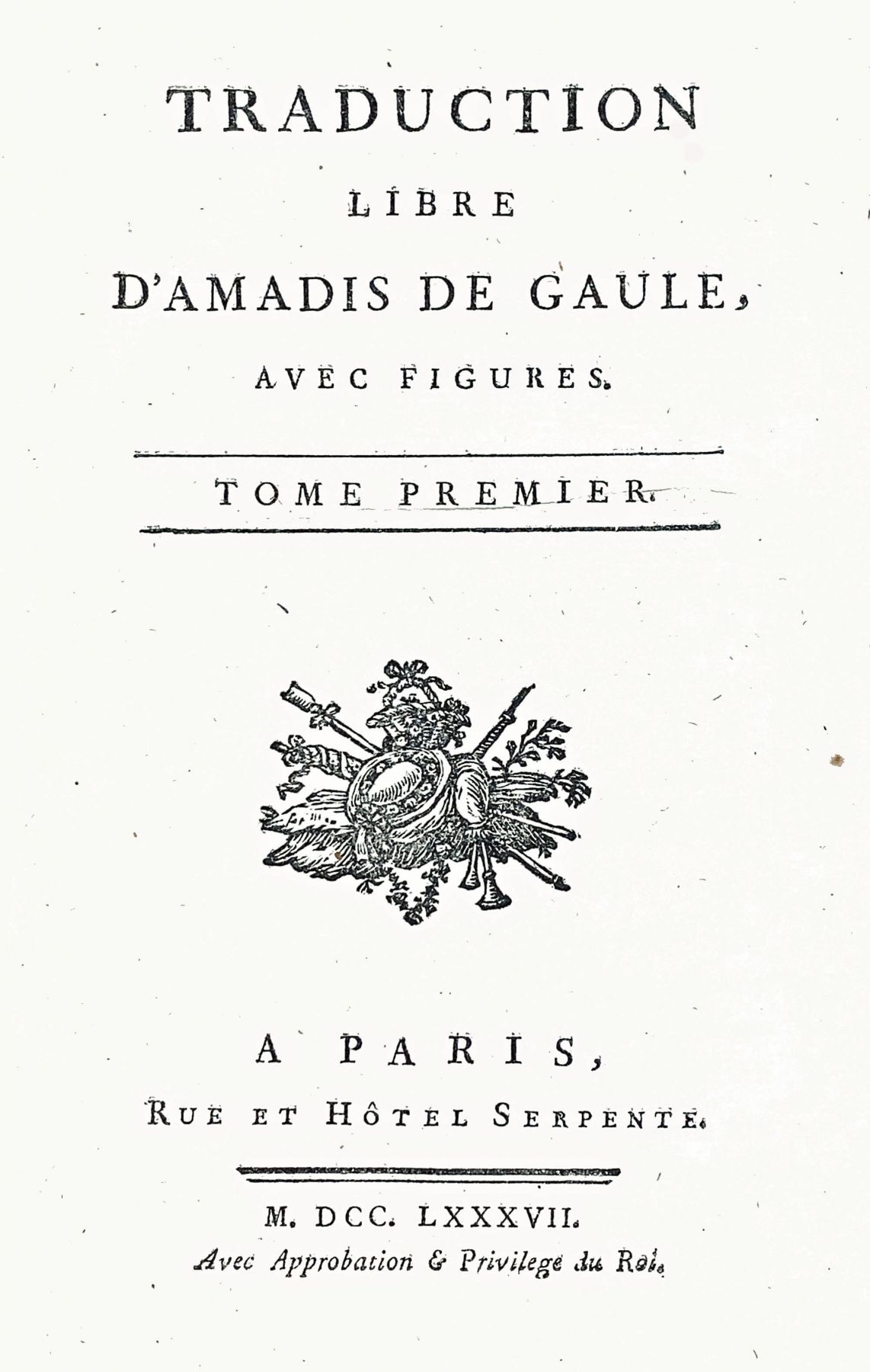 TRESSAN, comte de. Œuvres choisies du comte de Tressan, avec Figures. Traduction libre d’Amadis de Gaule restituée par Nicolas d’Herberay. Paris, Rue et Hôtel Serpente, Maradan et Desray, 1787-1791. Douze volumes in-8 [196 x 122 mm], demi-veau marbré à petits coins, dos lisses ornés, pièce de titres et de tomaison en veau rouge et vert, tranches rouges (Reliures anciennes). Orné de vingt gravures hors-texte par Marillier.