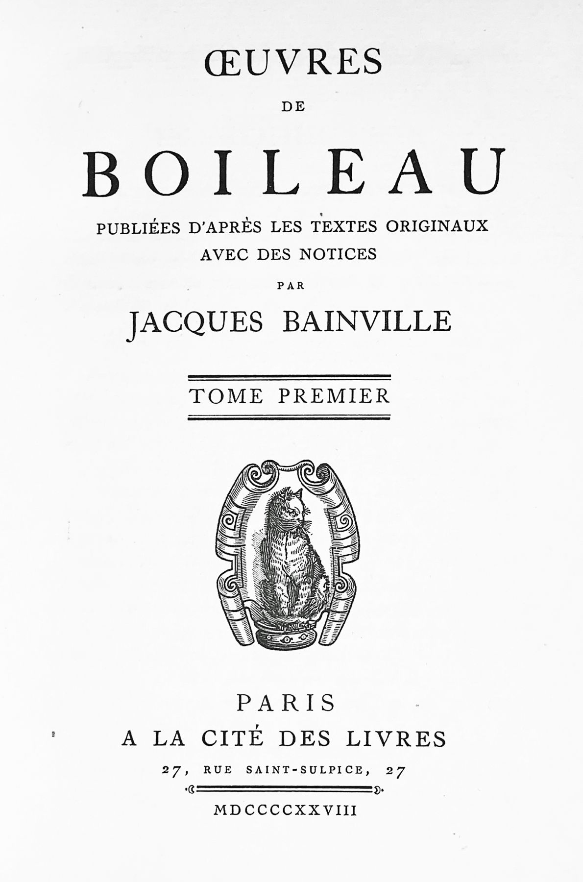BOILEAU-DESPREAUX Nicolas. Œuvres. Publiées d’après les textes originaux avec des notices par Jacques Bainville. Paris, La Cité des Livres, 1928-1929; 5 volumes in-8 [180 x 127 mm], demi-pécari havane, dos à nerfs orné de triple filet à froid se prolongents sur les mors, têtes dorées, couvertures, non rognés (E. Schroth, Basle). Tiré à 1040 exemplaires, celui-ci sur vergé à la forme des papeteries d’Arches. BEL EXEMPLAIRE.