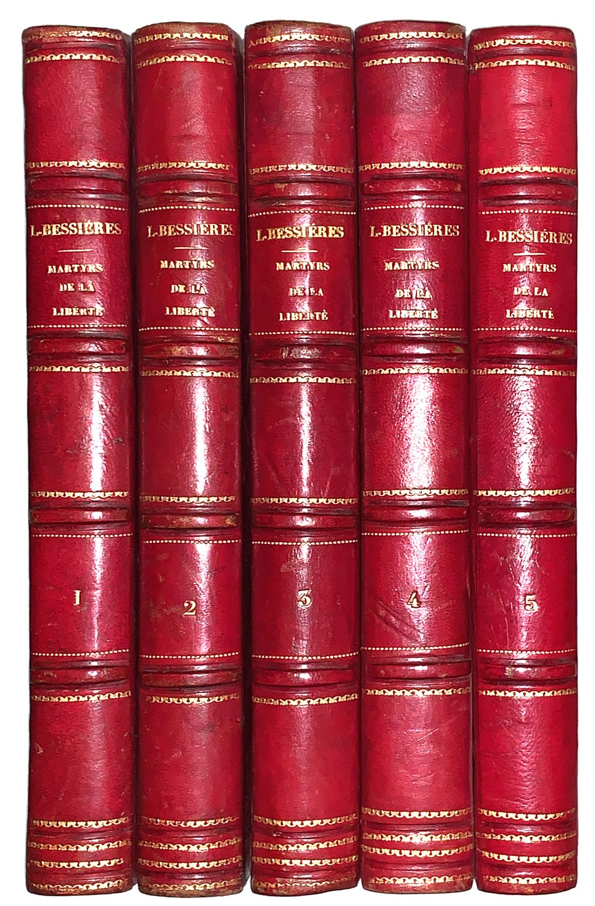 BESSIERES Lucien. Martyrs de la liberté ou Histoire des révolutions politiques et des personnages qui se sont dévoués pour le bien et la liberté des nations. Dessins de R. de Moraine. Paris, Eugene et Victor Penaud frères, s.d. 1848-1850), 5 volumes in-4, demi veau rouge de l’époque, dos à nerfs orné.