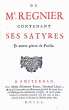 1 feuillet blanc, frontispice, titre, dédicace au roi & «Ode à Regnier, sur ses satires», 209 pages, «Table des Oeuvres du Sieur Regnier».