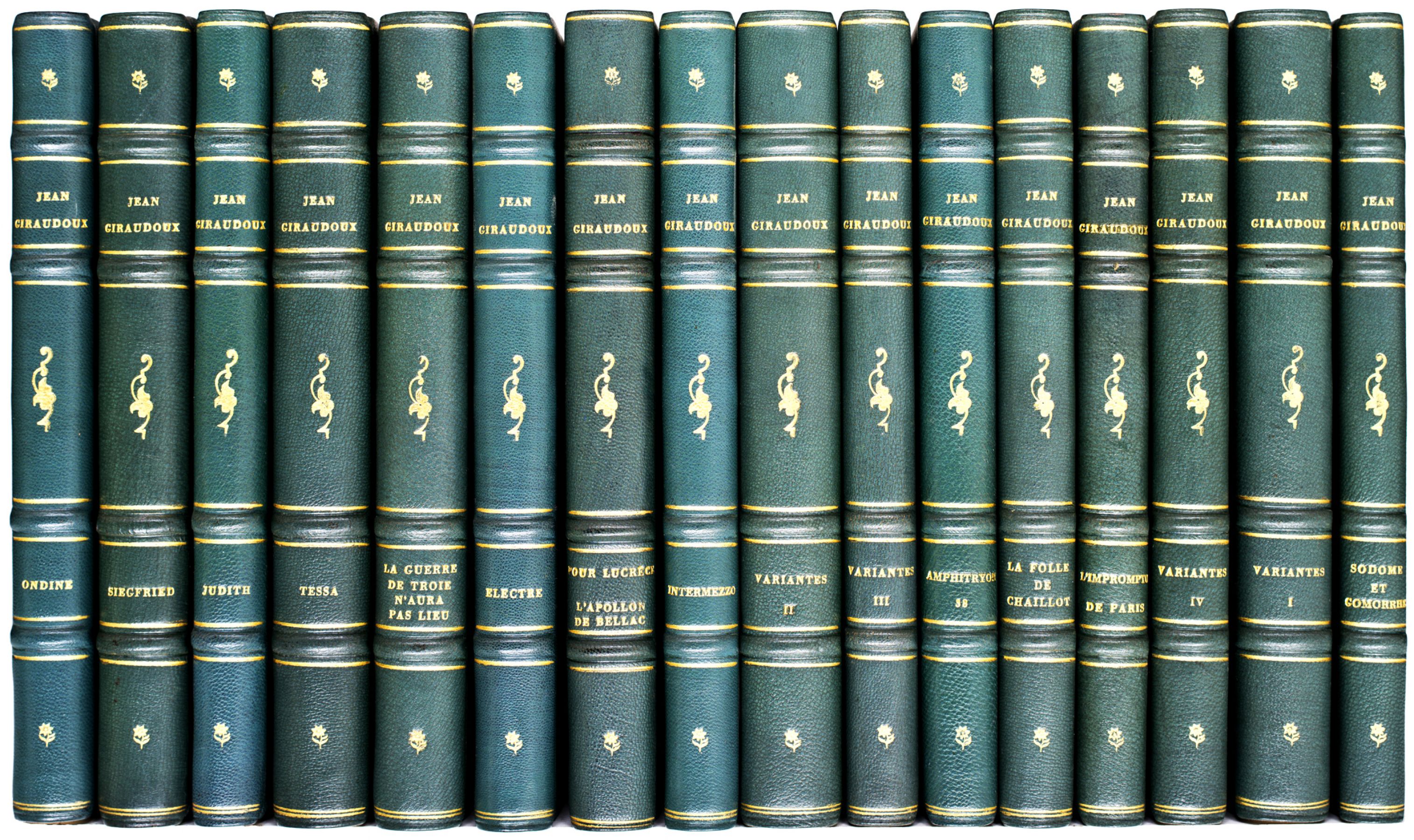 Tome1: Siegfried. 2: Judith. 3 : Amphitryon 38. 4 : Intermezzo. 5 : Tessa. 6 : La Guerre de Troie n'aura pas lieu. - Supplément au voyage de Cook. 7 : Electre. 8 : L'Impromptu de Paris. - Cantique des Cantiques. 9 : Ondine. 10) Sodome et Gomorrhe. 11 : La Folle de Chaillot. 12 : Variantes 1. Siegfried von Kleist suivi de scènes inédites. 13 : Variantes II. Intermezzo suivi de scènes inédites de Judith et d'Amphitryon. 14 : Variantes III. Fragments inédits de La guerre de Troie n'aura pas lieu. Electre. L'impromptu de Paris. Cantique des Cantiques. Ondine. L'Apollon de Bellac. 15 : Variantes IV. La folle de Chaillot précédé d'un fragment de Sodome et Gomorrhe. Tome 16 et dernier : Pour Lucrèce (Edition originale). L'Apollon de Bellac. Edition originale de «Pour Lucrèce» (tome 16). Contient toutes les variantes et des pièces inédites.