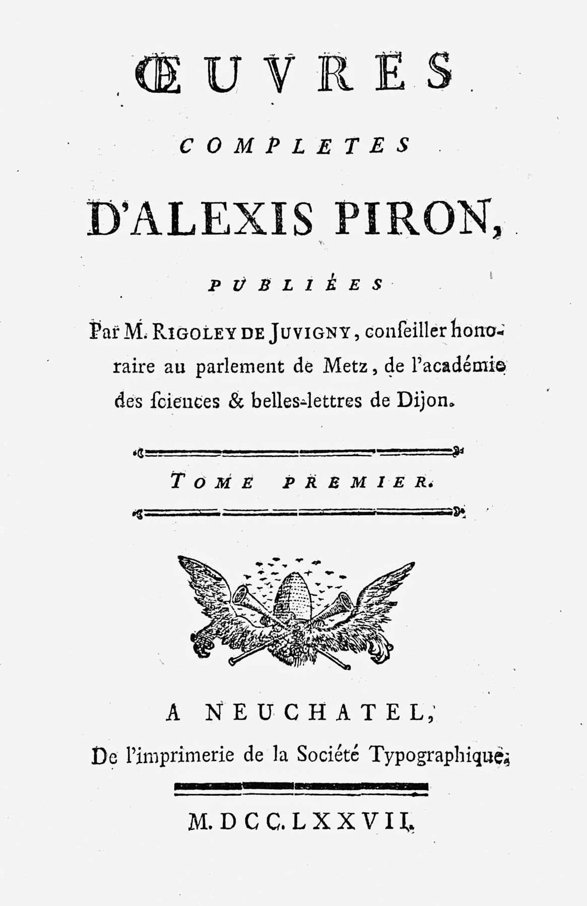 PIRON Alexis. Oeuvres complètes. Publiées par R. de Juvigny. Neuchâtel, de l'Imprimerie de la Société Typographique, 1777-1778, 7 volumes in-8, veau blond, dos lisses ornés de motifs dorés à la grotesque, pièces de titre et de tomaison de maroquin rouge, filet à froid sur les plats, tranches mouchetées. Illustrée d'un portrait de l'auteur par Aug. de Saint Aubin gravé par Billé.