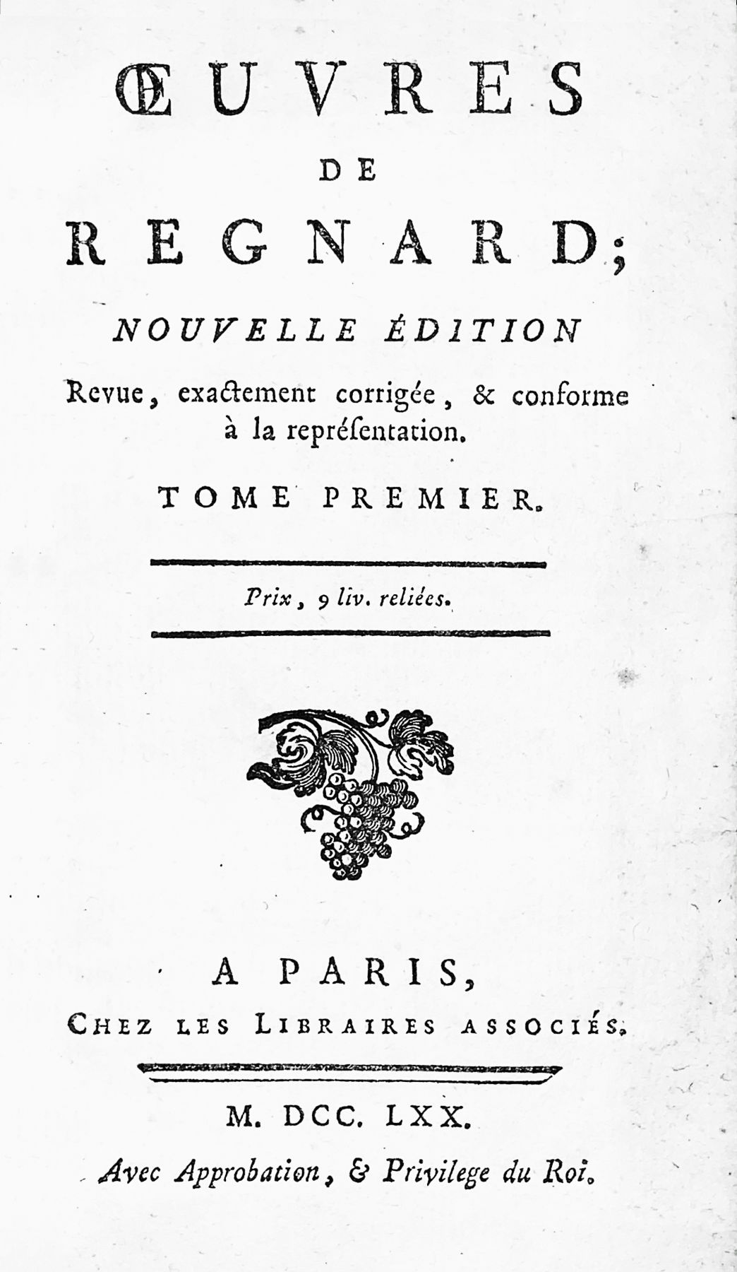 REGNARD Jean-François. Œuvres. revues, exactement corrigées, conforme à la représentation. Paris, Librairies associées, 1740; 4 volumes in-12, plein veau, dos lisse orné, pièces de titre et de tomaison de maroquin bordeaux et vert (Reliure de l’époque).