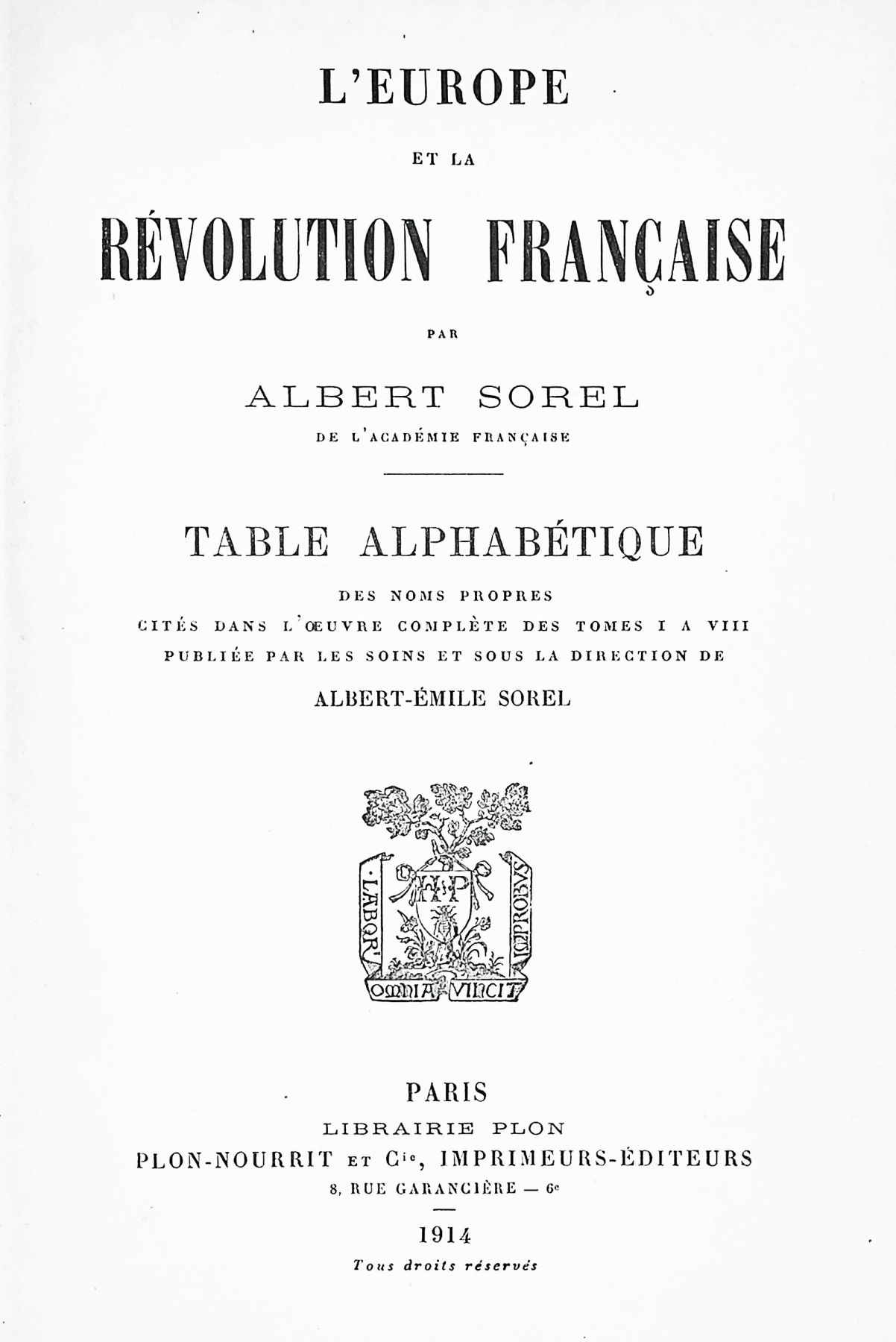 SOREL Albert. L’Europe et la Révolution française. Paris, E. Plon, Nourrit & Cie., 1887-1902; 9 volumes in-8, reliure rigide demi-toile. Tome 9 renferme une importante Table alphabétique. L’ouvrage capital de l’auteur, où il s’est occupé surtout des effets de la Révolution en Europe.