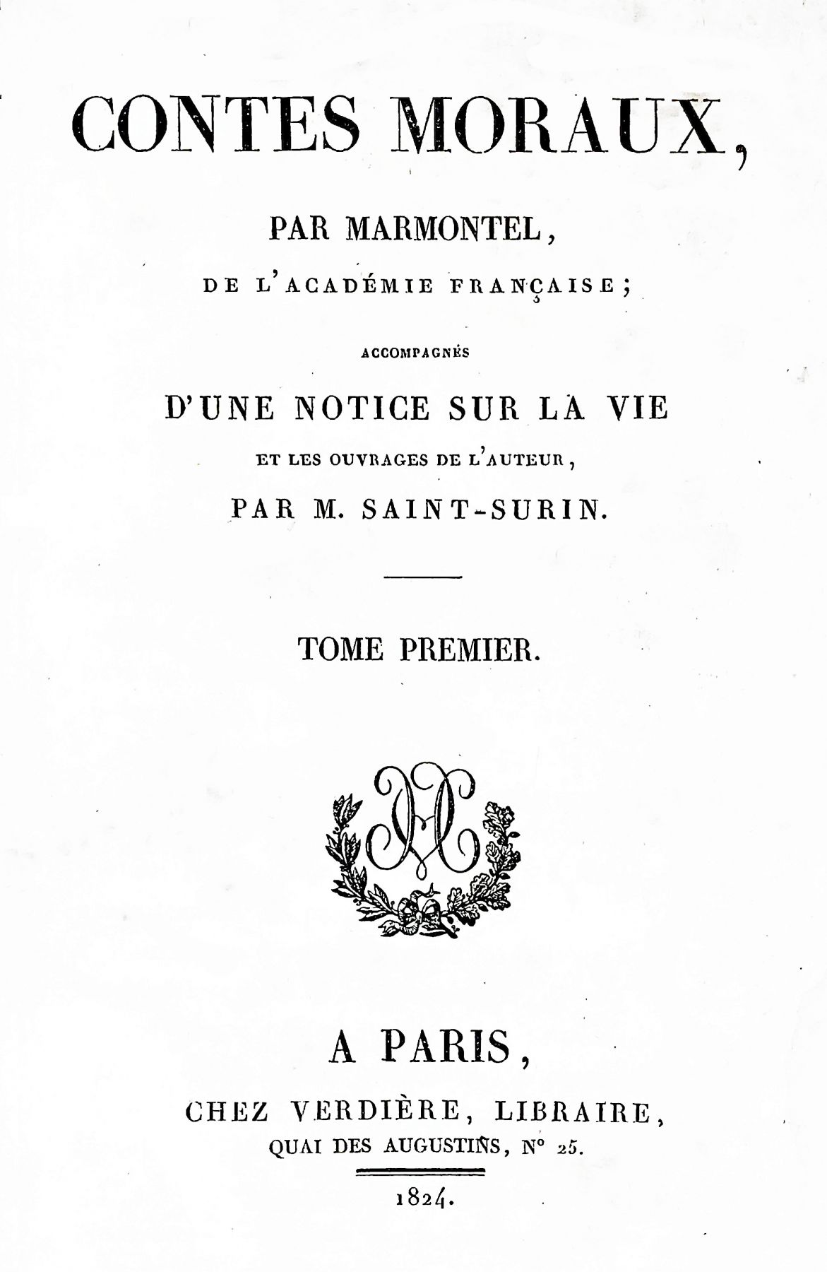 MARMONTEL Jean-François. Contes moraux. Accompagnés d’une notice sur la vie et les ouvrages de l’auteur, par Saint-Surin. Paris, chez Verdière, 1824; 4 volumes in-8, demi-veau vert de l’époque, dos à nerfs orné, titre et tomaisons dorés. Quelques rousseurs.