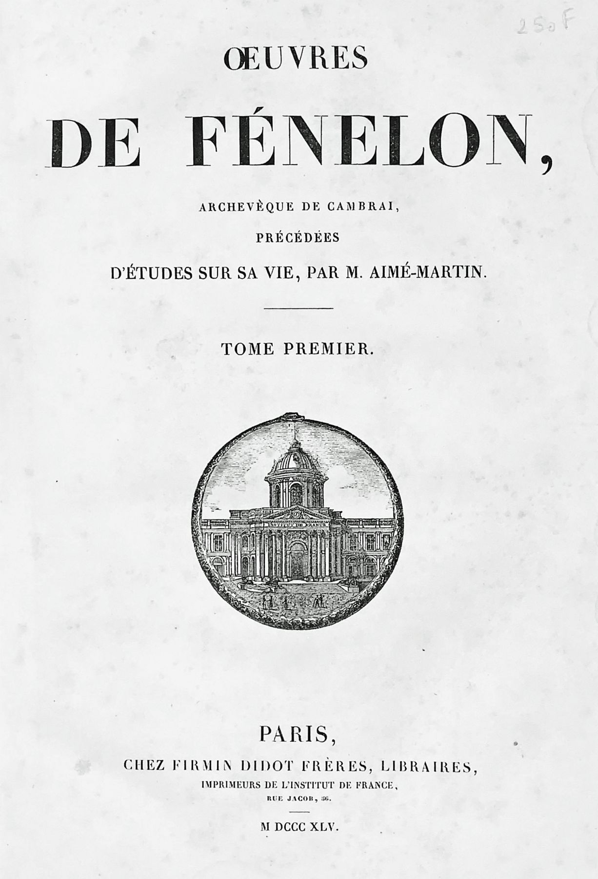 FENELON François de Salignac de la Mothe. Œuvres. Précédées d’études sur sa vie par M. Aimé-Martin. Paris, Firmin Didot, 1845; 3 vol. in-4, demi-chagrin noir à coins de l’époque, dos à nerfs orné de filet doré et cadre à froid entre nerfs, titre et tomaisons dorés ( J.C. Lacouture).