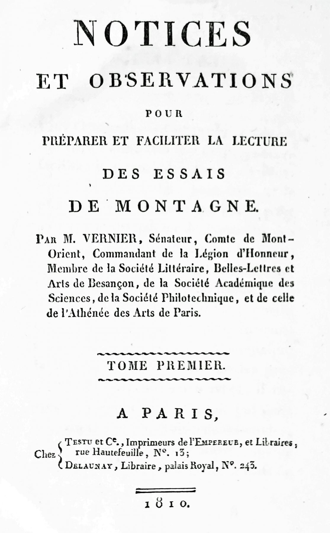 VERNIER Théodor. Notices et observations pour préparer et faciliter la lecture des Essais de Montaigne. Paris, Testu et Cie., Delaunay, 1810, deux volumes in-8 [207 x 120mm], demi-veau brun, dos lisse orné et doré, pièces de titres et de tomaison de maroquin rouge, tranches mouchetées.