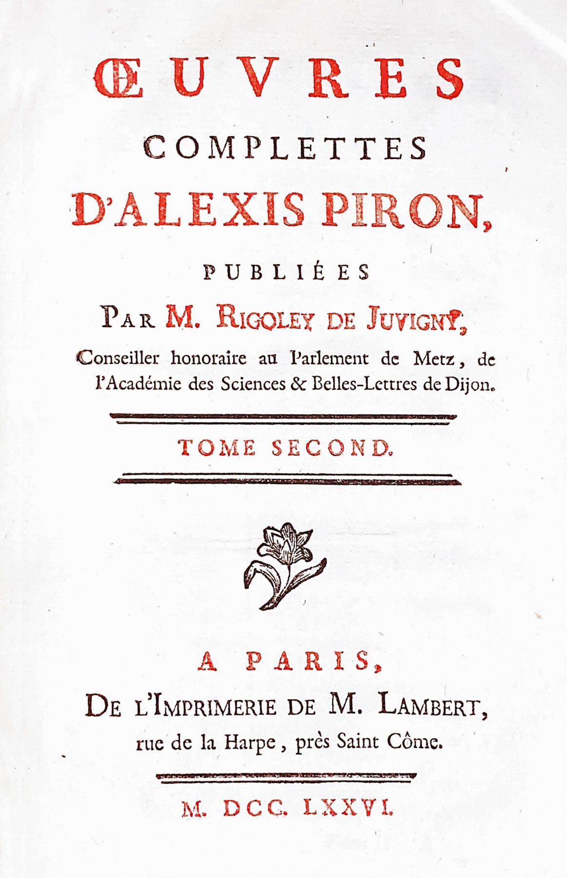 PIRON Alexis. Oeuvres complètes. Publiées par Rogoley de Juvigny. Paris, De l'Imprimerie de Lambert, 1776. 7 volumes in-8, plein veau tabac, dos à nerfs ornés, pièces de tomaison en maroquin bordeaux (Reliure de l’époque).