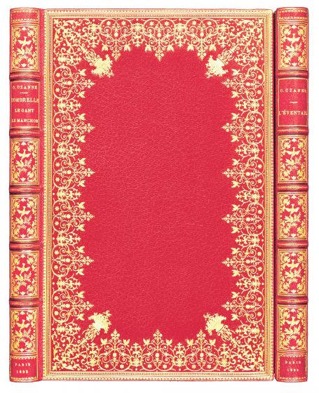 UZANNE Octave. L’éventail. - L’Ombrelle. - Le Gant. -  Le Manchon. Paris, Quantin, 1882-1883. Deux volumes grand in-8 [262 x 165 mm], maroquin rouge, plats richement décorés d’encadrements de roulettes, filets et pointillés dorés avec large dentelle aux petits fers dorés, dos à nerfs ornés de même, doublure de soie vert d’eau ornée d’un motif peint différent pour chaque plat par P. Avril, dentelle intérieure, gardes de soie moirées vertes, tranches dorées, double filet sur les coupes, couverture illustrée et dos. (Reliure de l’époque). Edition ornée de deux frontispices, deux planches  polychromes et de cent trente illustrations de Paul Avril, gravées en taille-douce, tirées en bleu, brun, vert, violet, noir, bistre ou en sanguine, certaines à caractère érotique. Textes entourés de cadres, différents de chaque page, gravés sur bois.