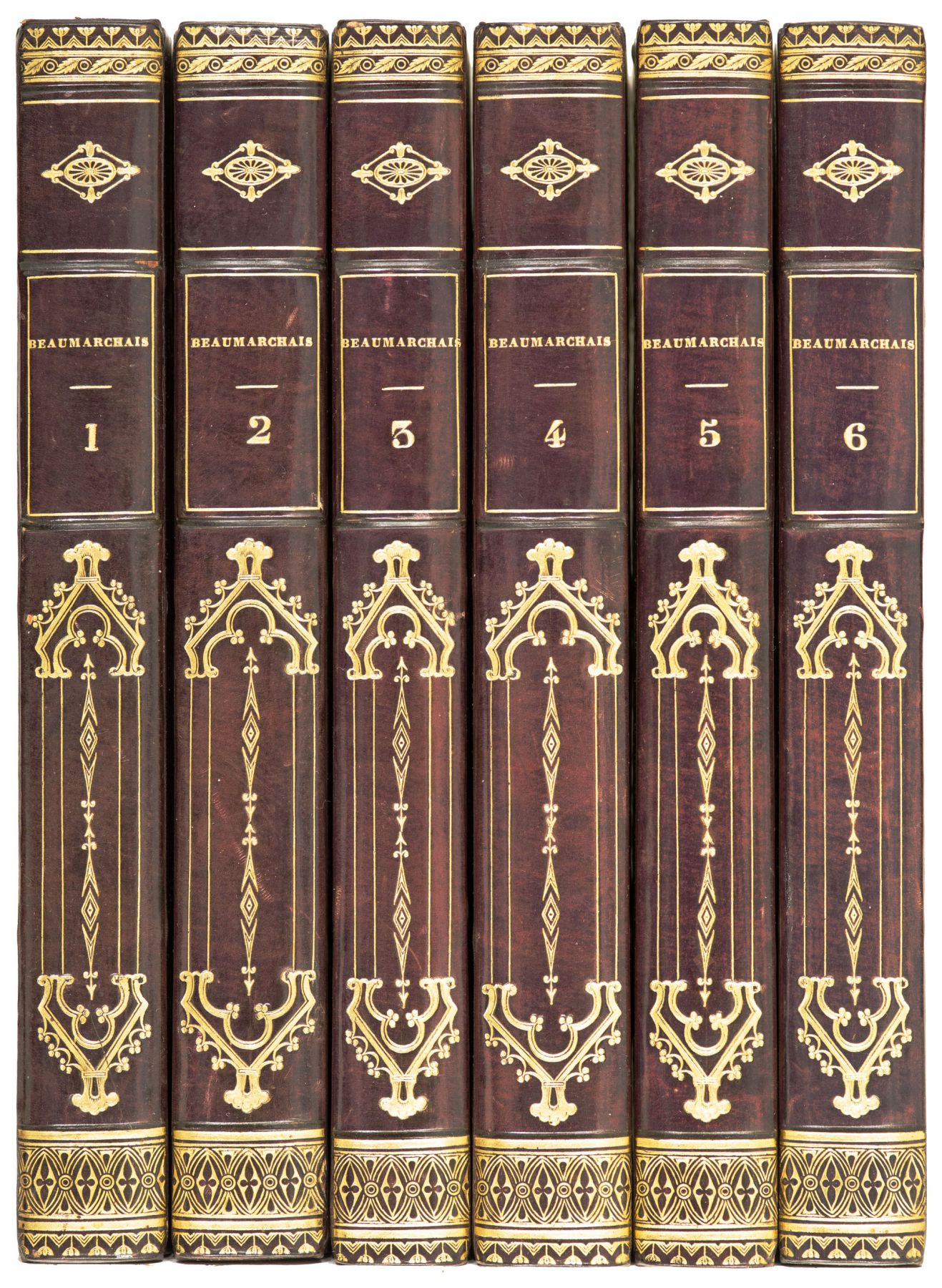BEAUMARCHAIS Pierre Augustin Caron de. Œuvres complètes. Précédées d’une Notice sur sa Vie et ses Ouvrages par La Harpe. Edition ornée de gravures. Paris, Furne, 1828. 6 volumes in-8 [209 x 124 mm], demi-veau violet glacé, dos ornés en long à la cathédrale, pièces de titres contenant le nom de l’auteur et la tomaison sur un cabochon en relief, filets dorés sur les plats, tranches marbrées (Reliure de l’époque).