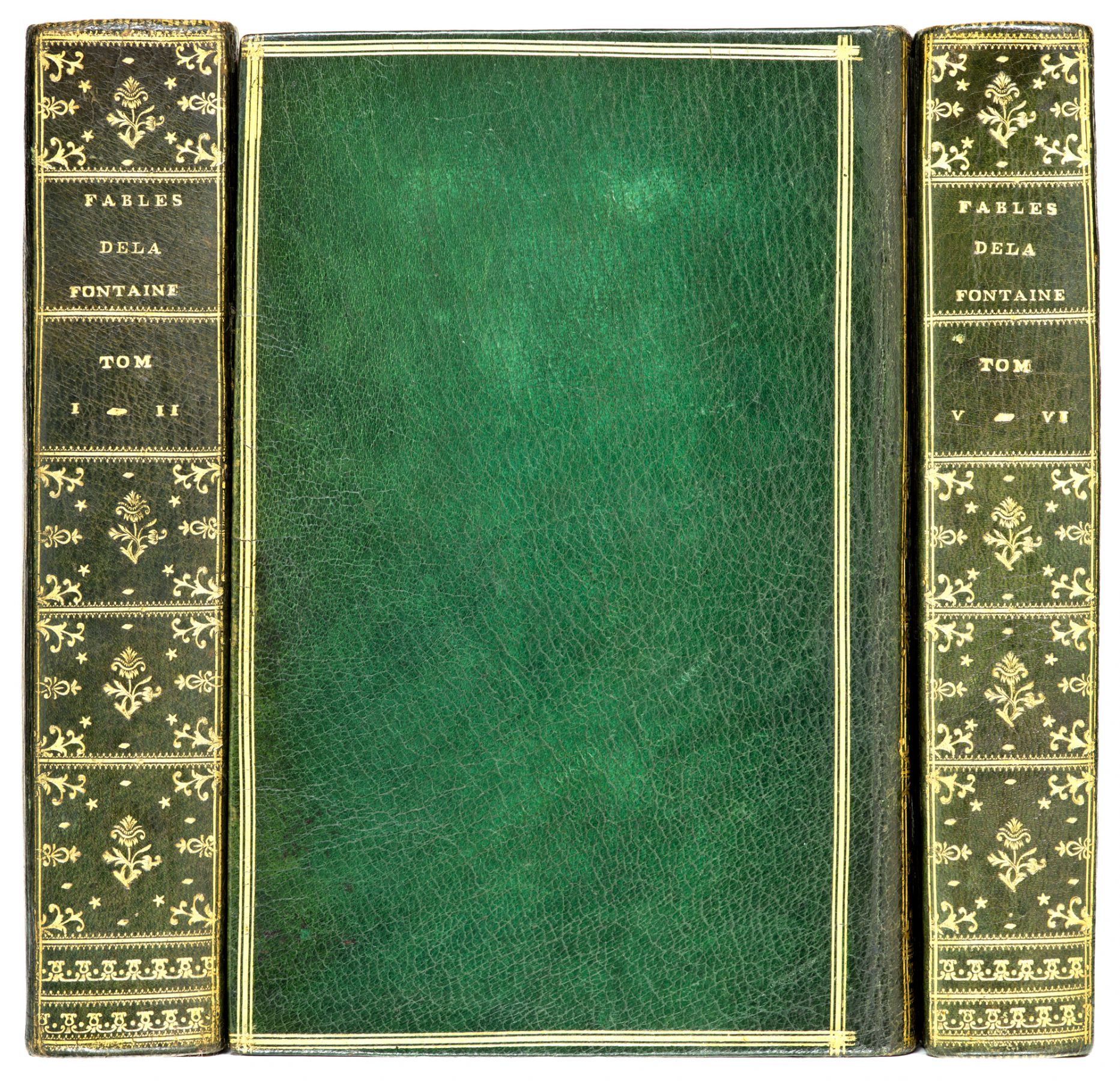 LA FONTAINE Jean de. Fables choisies, mises en vers. Nouvelle édition gravée en taille-douce. Les figures par le Sr. Fessard. Le texte par le Sr. Montulay. Dédiées aux Enfants de France. Paris, Chez l’auteur, graveur ordinaire du Cabinet du Roy, 1765-1775. 6 tomes reliés en 3 volumes in-8 [196 x 122 mm], maroquin vert, dos lisse orné à petits fers, triple filet doré encadrant les plats, coupes et bordure intérieure décorées, tranches dorées. (Reliure de l’époque).