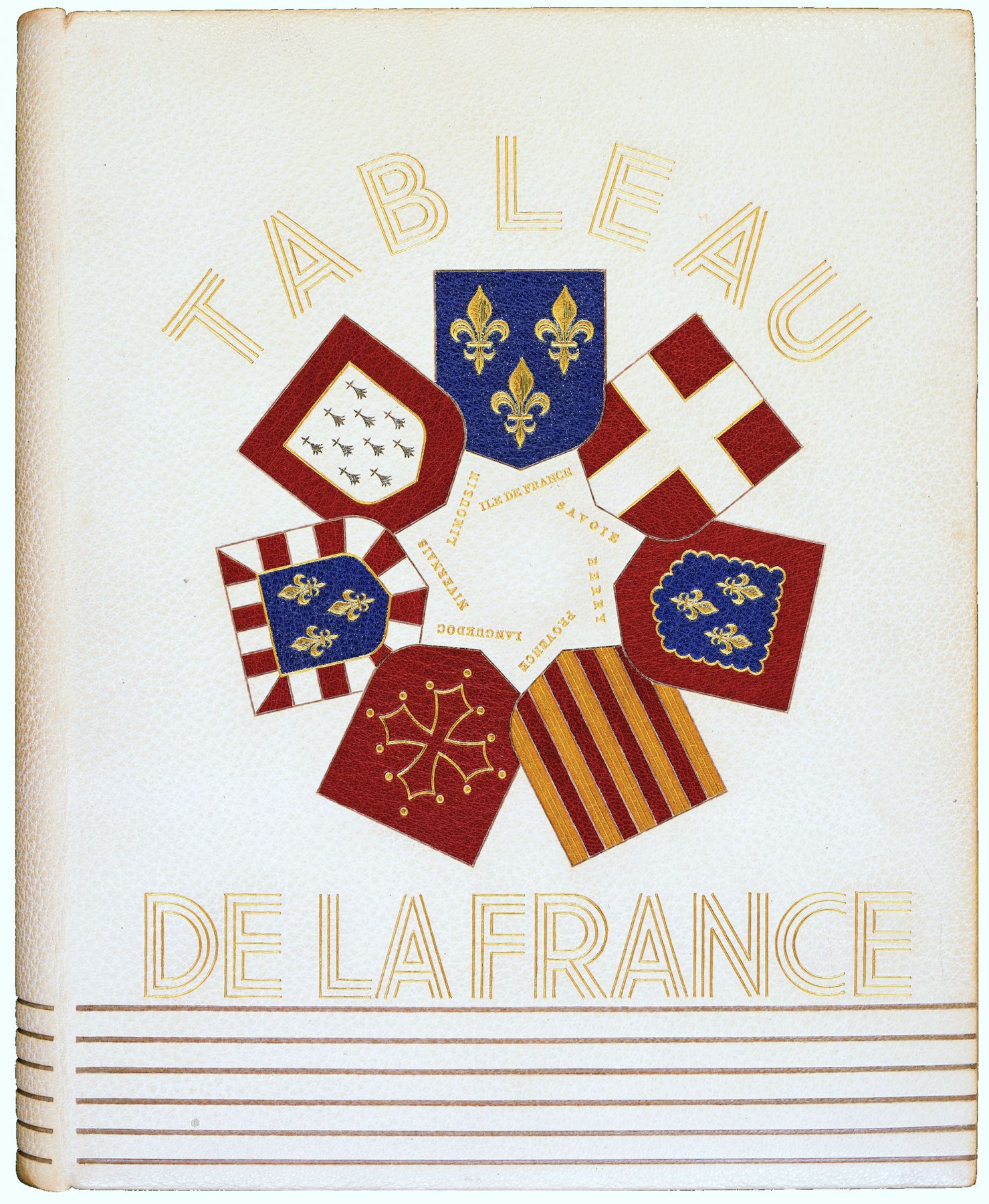 MICHELET Jules. Tableau de la France. Préface de Daniel Halévy. Paris, Les Bibliophiles Franco - Suisses, 1936. Grand in-4 [303 x 235 mm], maroquin blanc, six filets à froid traversent horizontalement les plats, sur le premier décor d’armoiries de grandes familles de France mosaïqués et dorés en maroquin rouge, jaune et bleu, dos lisse, large cardre de maroquin blanc avec filet or intérieur, tranches dorées sur témoins, couverture, étui (G. Cretté). Une double carte en couleurs du Royaume de France, deux fragments d’un manuscrit, 64 planches en couleurs dont neuf et une double hors texte dessinées et gravées sur bois par Paul Boudier. Tiré à 115 exemplaires tous sur Vélin de Rives enrichi d’une suite complète des bois en couleurs sur papier de Chine et six dessins originaux, signés par l’artiste. Très bel exemplaire en maroquin blanc relié par Georges Cretté sr de Marius Michel.