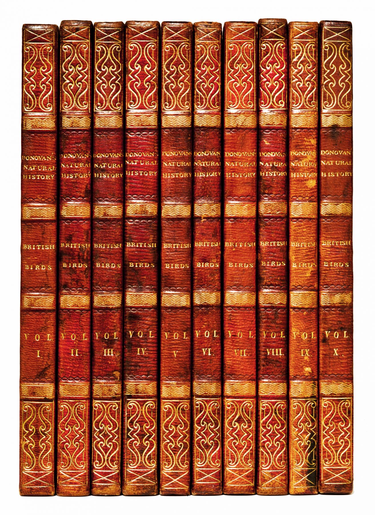 [Ornithologie] - DONOVAN Edward. The Natural History of British Birds; or, a selection of the most rare, beautiful, and interesting birds which inhabit this country. London, E. Donovan, F. & C. Rivington, 1794-1820. Dix volumes in-8 [224 x 136 mm], demi-maroquin rouge à grain long aux petits coins, dos lisses à faux nerfs ornés et dorés, tranches marbrées (Reliure de l’époque).