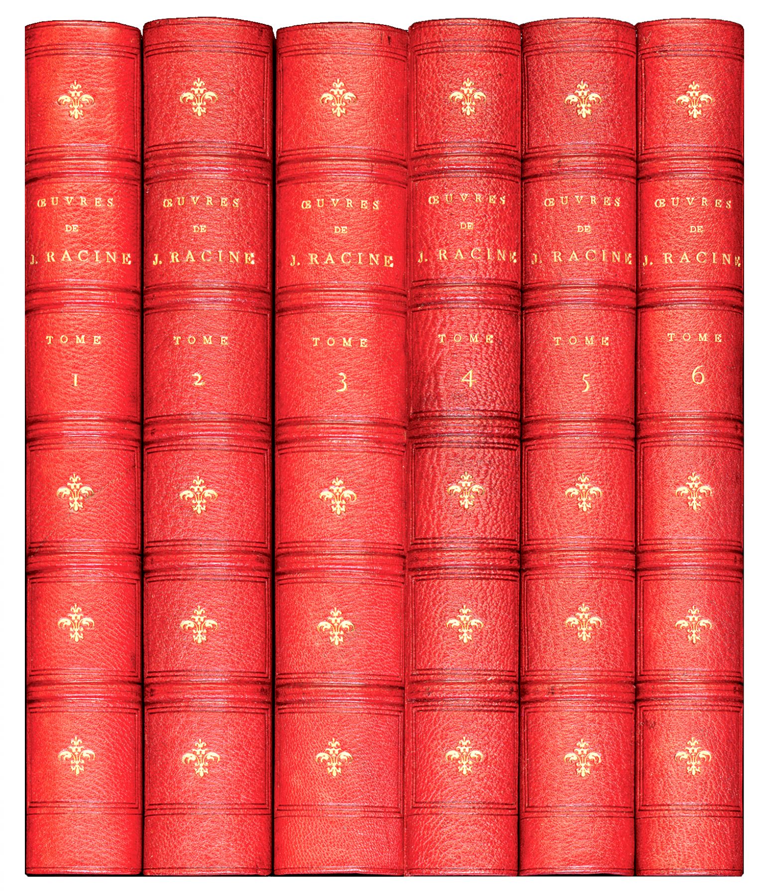 RACINE Jean. Œuvres complètes. Avec les notes de tous les commentateurs. Cinquième édition publiée par L. Aimé-Martin, avec des additions nouvelles. Paris, Lefèvre et Furne, 1844. 6 volumes, in-8. - Lettres inédites de Jean Racine et de Louis Racine, précédées de la vie de Jean Racine et d’une notice sur Louis Racine, etc. par leur petit-fils l’abbé Adrien de la Roque. Paris, Hachette, 1862; in-8. En tout sept volumes in-8 [232 x 149 mm], demi-maroquin aubergine à coins, dos à nerfs ornés, tête dorées, non rognés (Petit succr. de Simier) Bel édition illustrée d'un portrait d’après Edelinck, gravé par Pannier et 14 figures de Chaudet, Girodet, Deveria, Gérard, Desenne et Tanoy, gravées par Lefèvre, Sisco, François Colin et Pigeot. BEL EXEMPLAIRE. Dos légèrement passés.