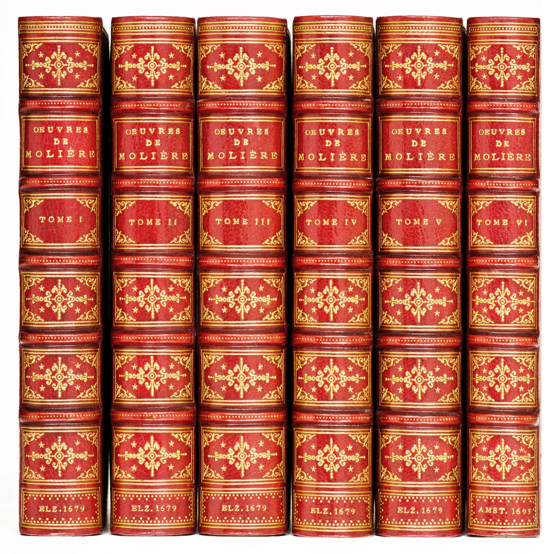 MOLIERE Jean-Baptiste POQUELIN de. Oeuvres. - Oeuvres posthumes. Amsterdam, Jaques-le-Jeune [Daniel Elzévier, puis Henri Wetstein], 1679 et 1693. Six volumes petit in-12 [131 x 71 mm], à pagination séparée: maroquin rouge, dos à nerfs richement ornés et dorés aux petits fers, triple filet doré en entourage sur les plats, coupes filetées, dentelle intérieure dorée, tranches dorées sur marbrures. (Cuzin).