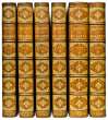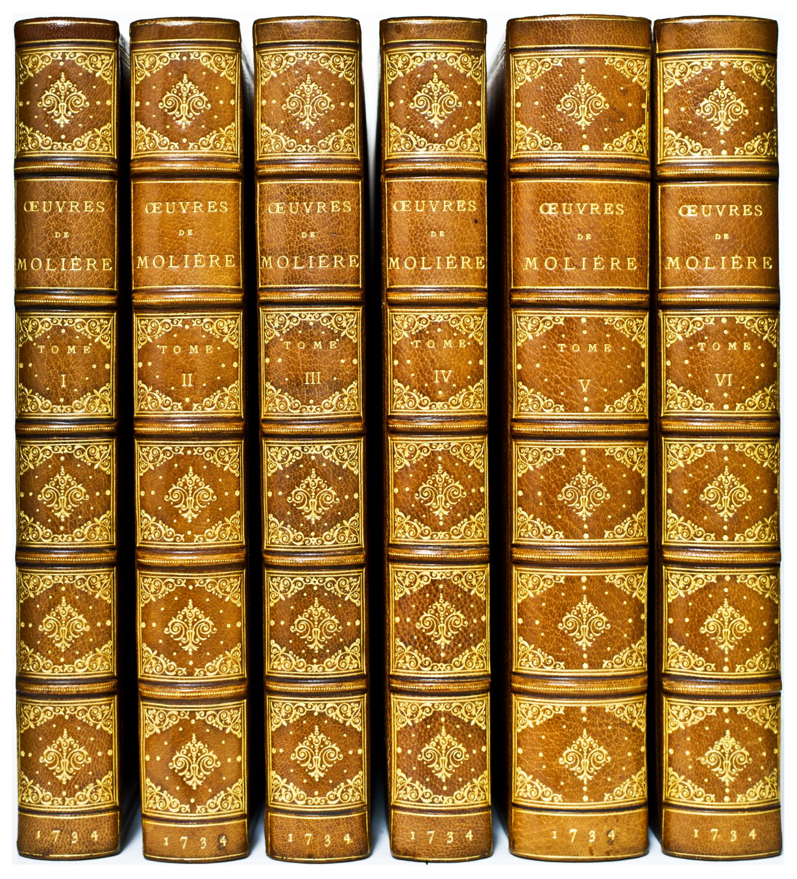 MOLIERE Jean-Baptiste POQUELIN de. Oeuvres. Nouvelle édition. A Paris, [Prault], 1734. 6 volumes in-4 [283 x 2142mm], maroquin brun, dos à cinq nerfs richement ornés et dorés, quatre filets encadrant les plats, dentelle intérieure, double filet doré sur les coupes, tranches dorées (Reliure du XIXe siècle).