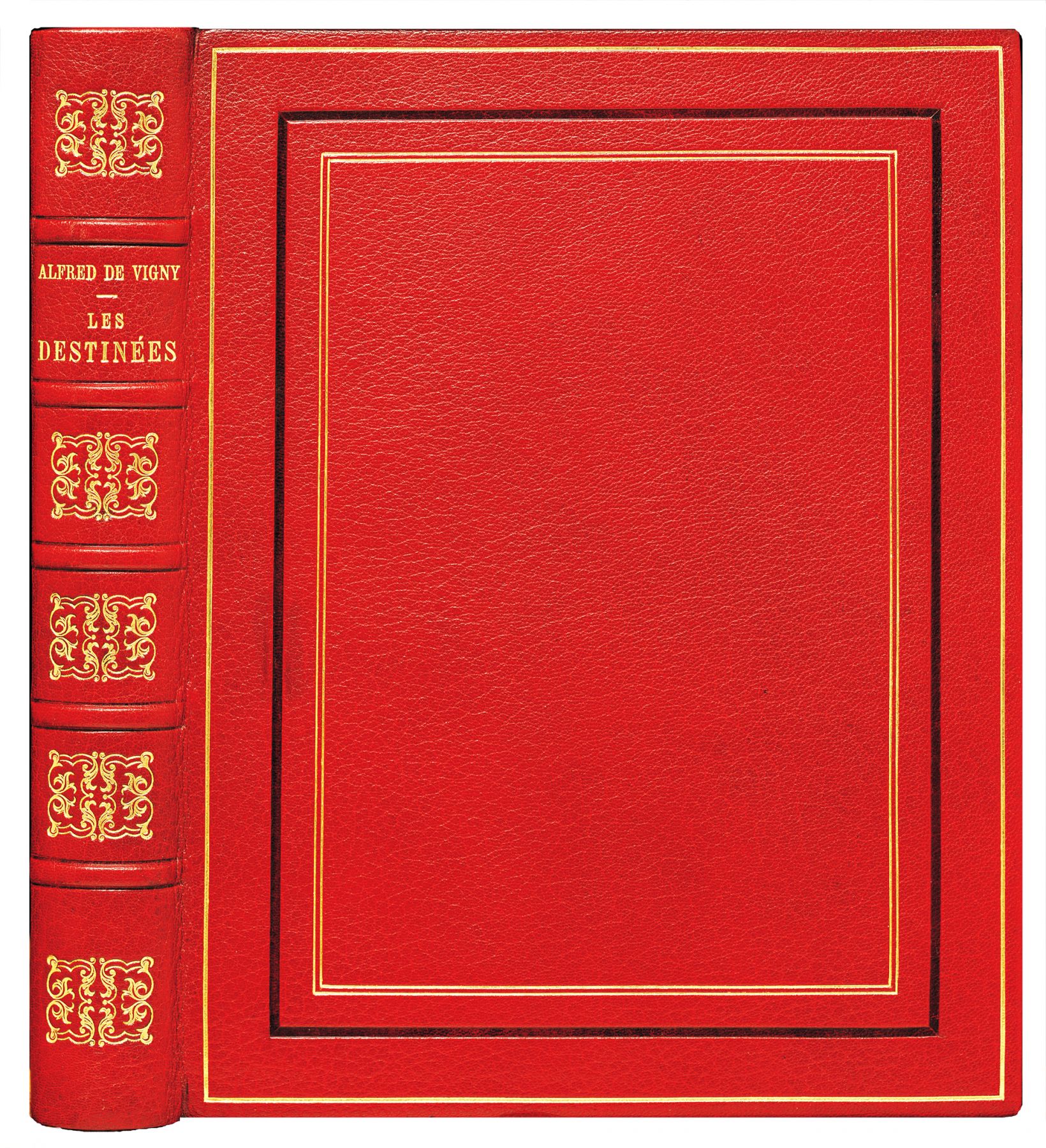 VIGNY Alfred de. Les Destinées précédées de Moïse. Paris, Edouard Pelletan, 1898. Grand in-4 [323 x 245 mm], maroquin bordeaux, l’encadrement sur les plats se compose de filet gras et double filet mince dorés et filet gras à froid, dos à cinq nerfs richement orné et doré, cadre de maroquin bordeaux à l’intérieur, gardes de satin bordeaux, tête dorée, couvertures et dos conservés, étuis (Andréas).