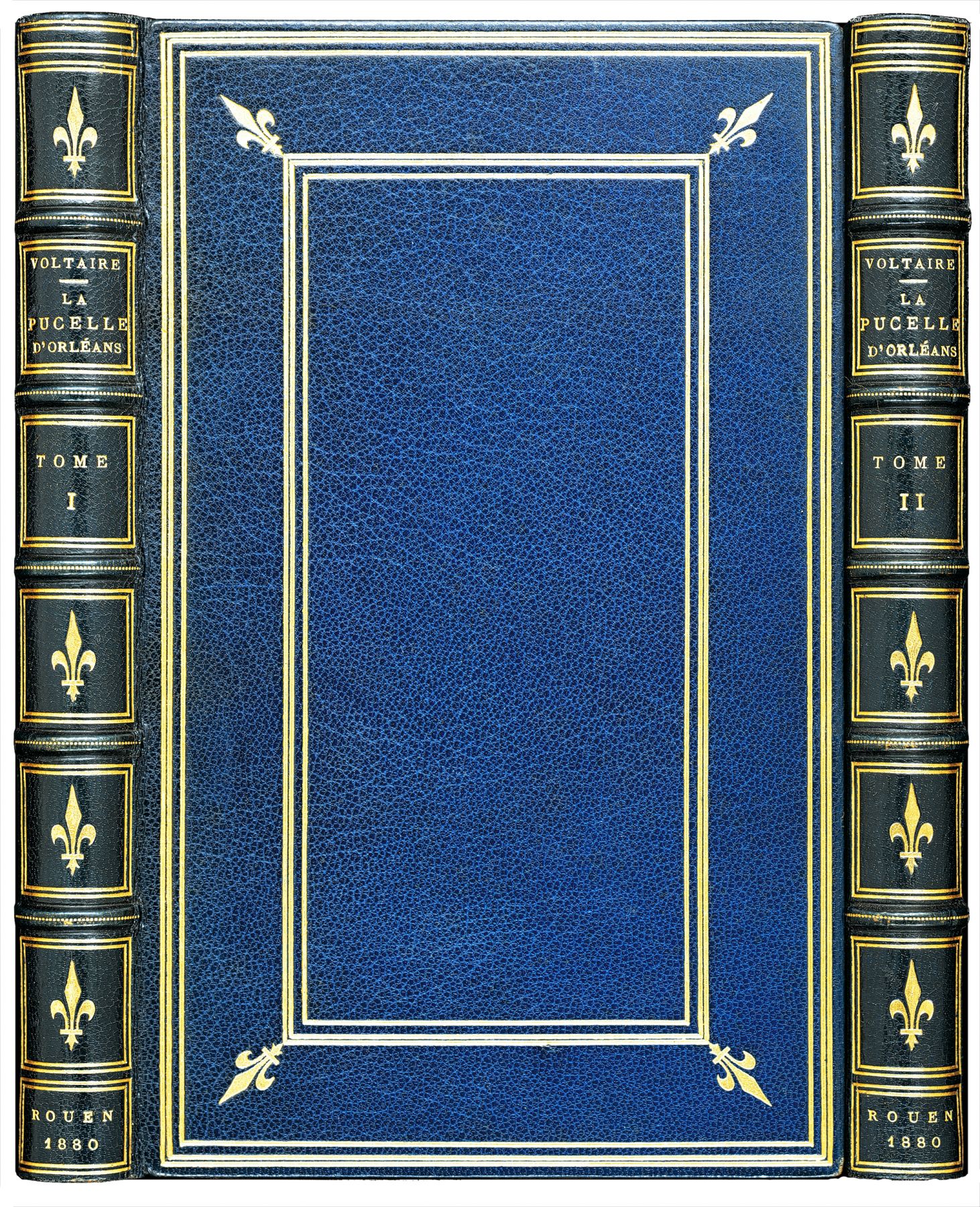 VOLTAIRE. La Pucelle d’Orléans. Poème en vingt-et-un chants. Rouen, Chez Jean Lemonnyer, 1880. Deux volumes in-8 [197 x 121 mm], maroquin indigo, dos à nerfs ornés et dorés de caissons et de fleurs de lys, plats entourés d’un double encadrement doré à la Du Seuil, double filet doré sur les coupes, large dentelle dorée intérieure, tranches dorées sur marbrures (Smeers).