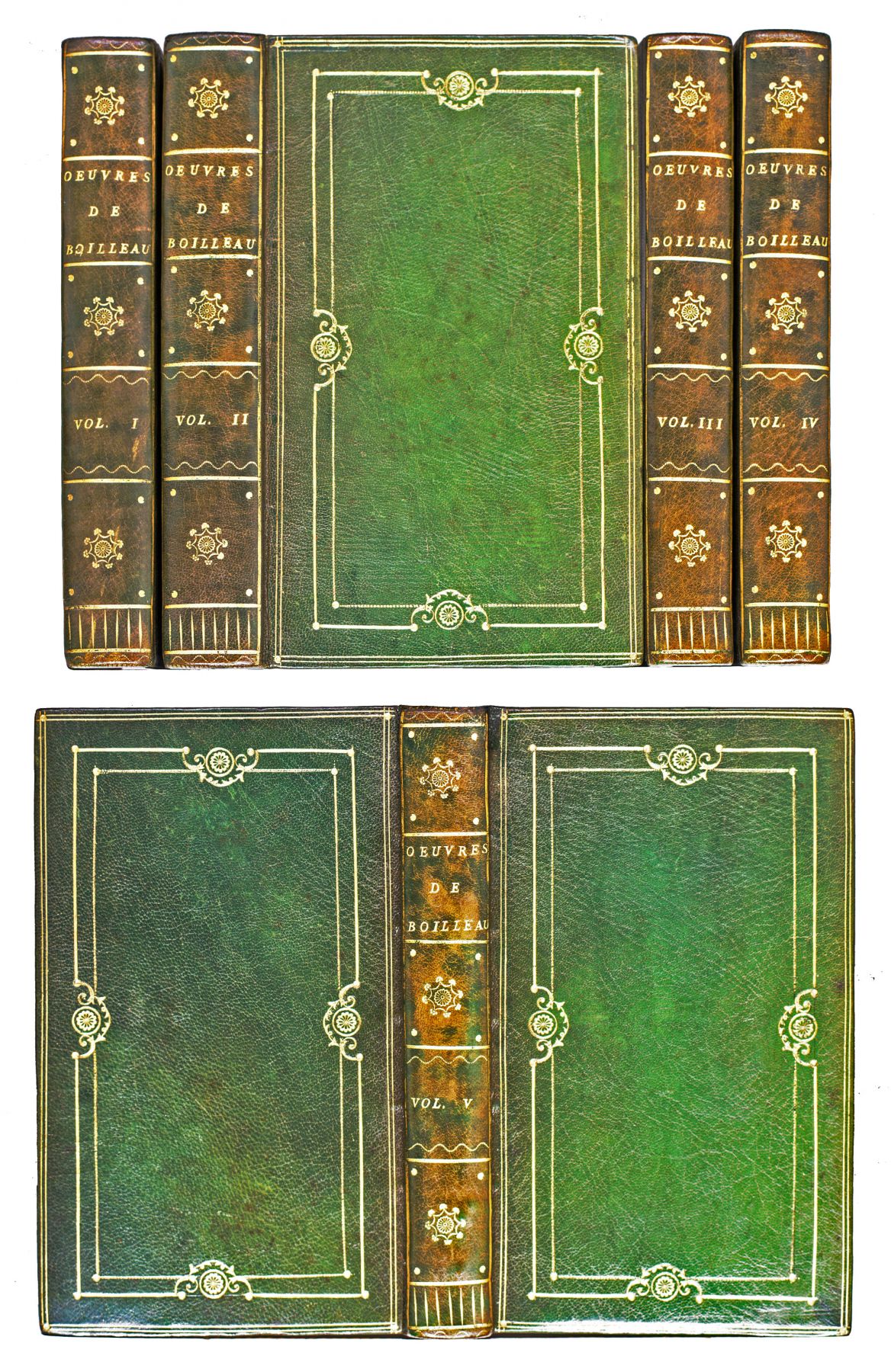BOILEAU-DESPREAUX. Œuvres. Avec des Eclaircissements historiques donnés par lui-même, & rédigés par M. Brosette et avec des Remarques & des Dissertations Critiques par M. de Saint-Marc. Paris, Chez les Libraires Associés, 1772. 5 volumes in-8 [210 x 125 mm], maroquin vert amande, dos lisses ornés, double encadrement avec fleurons dorés sur les plats, roulette sur les coupes et à l’intérieur, tranches dorées. (Reliure anglaise de l’époque). Edition illustrée de six figures d’après Bernard Picart, cinq frontispices d’après Picart et Van der Meer, gravés par Vinkelès, cinq fleurons sur les titres par Bakker et Van der Meer. Magnifique exemplaire dans une reliure anglaise de l’époque en maroquin vert, ce qui est rare et d’autant plus recherché*. * On compte sur dix reliures en maroquin rouge seulement une en maroquin vert. Quelques rousseurs. Dos passés.