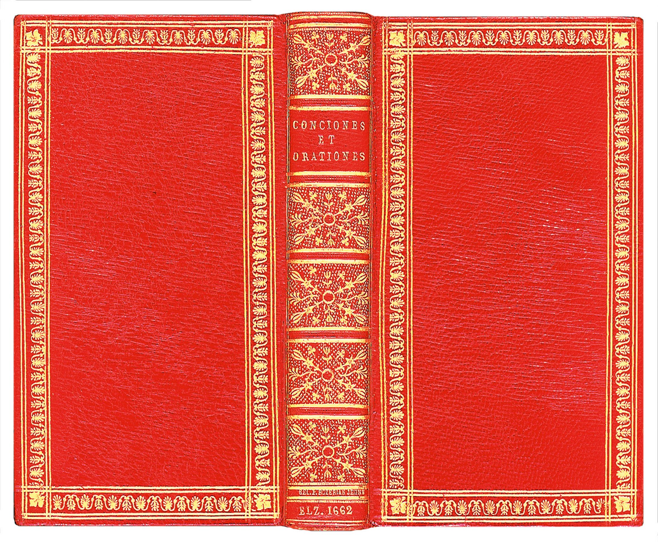 [Elzévier] - CONCIONES et Orationes, Ex Historicis Latinis Excerptae. Argumenta singulis praefixa sunt, quae causam cujusque & summam ex rei gestae occasione explicant. Opus recognitum recensitumque in usum scholarum Hollandiae & Westfrisiae. Amsterdam, Ex Officina Elzeviriana, 1662. Petit in-16 [131 x 72 mm], maroquin rouge à grain long, dos à nerfs finement orné et doré, roulette dorée encadrant les plats avec motifs d’angles, dentelle à la grecque intérieure, roulettes sur les coupes, tabis bleu, tranches dorées (Bozerian-le-Jeune). Charmant et très bel exemplaire dans une fine reliure caractéristique de Bozerian.