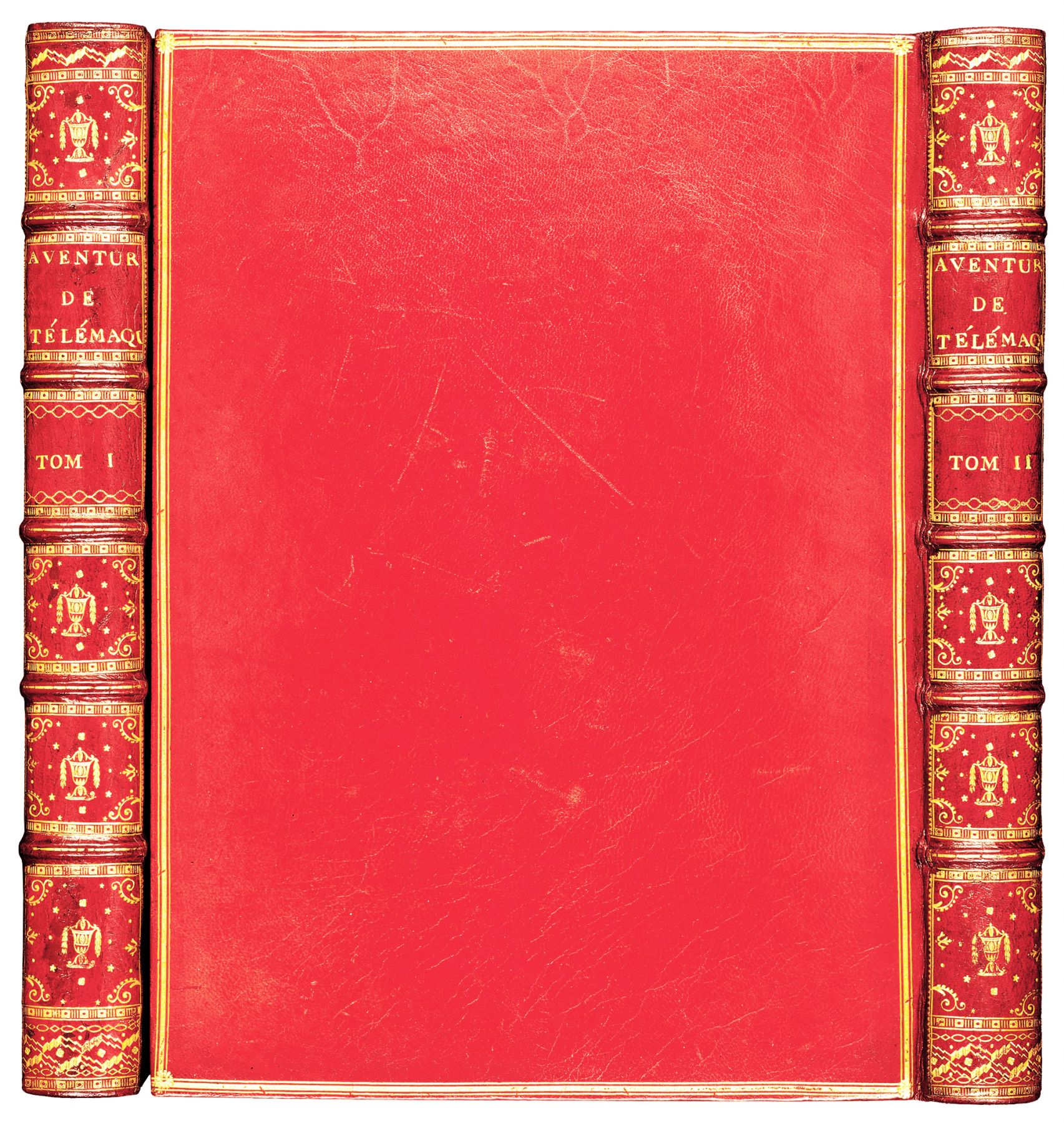FENELON. Les Aventures de Télémaque, fils d’Ulysse. Paris, de l’imprimerie de Monsieur, 1785. 2 volumes grand in-4 [327 x 240 mm], maroquin rouge, dos à cinq nerfs ornés de caissons et petits fers dorés, motif central d’urne à bords de feuillage tombant, encadrement des plats d’un filet gras entre deux filets maigres avec soleil en écoinçons, roulette dorée intérieure, double filet sur les coupes, tranches dorées. (Reliure de l’époque). Illustrées de: titre-frontispice - P. Chez l’Auteur, 1773 - gravé par Montulay, 72 figures d’après Charles Monnet, peintre du Roi, gravées par Jean- Baptiste Tilliard et 24 planches avec le texte des sommaires des chants, gravés et ornés de culs-de-lampe. Belle édition faite pour contenir la suite des figures de Monnet et Tilliard. Quelques rousseurs et pages légèrement brunies. Tache claire sur un plat du T.II.