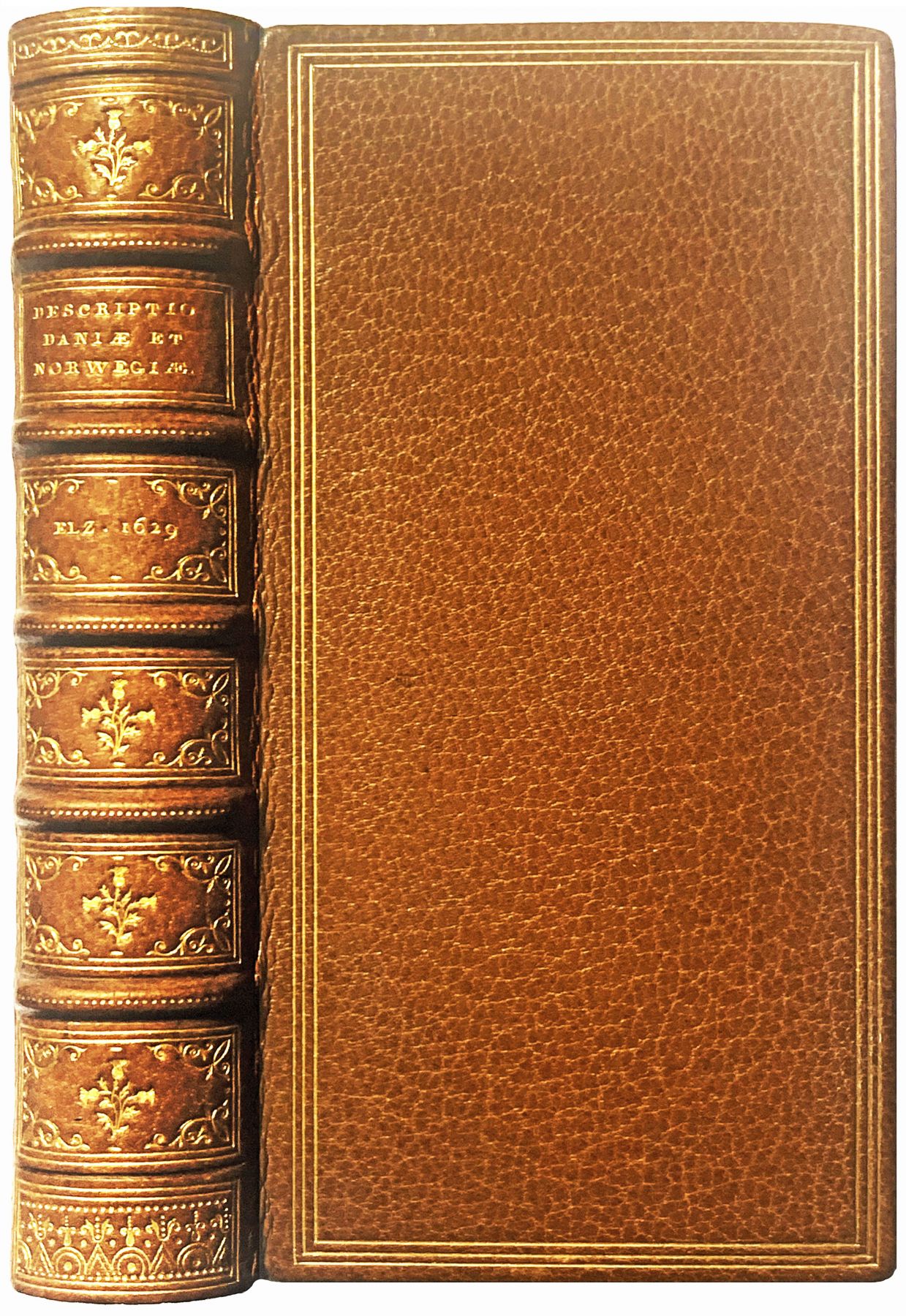 STEPHANUS Joannis Stepanius. De Regno et Norwegiae, insulisque adjacentibus juxtà ac de Holsatia, Ducatu Sleswicensi, et finitimis provincijs, tractatus varii. Lugduni Batavorum, ex officina Elzeviriana, 1629, in-24 [108x54mm], maroquin Havane, dos à nerfs orné et doré, triple filet doré encadrant les plats, double filet doré sur les coupes et roulette dorée intérieure, tranches dorées sur marbrures, (Cuzin).