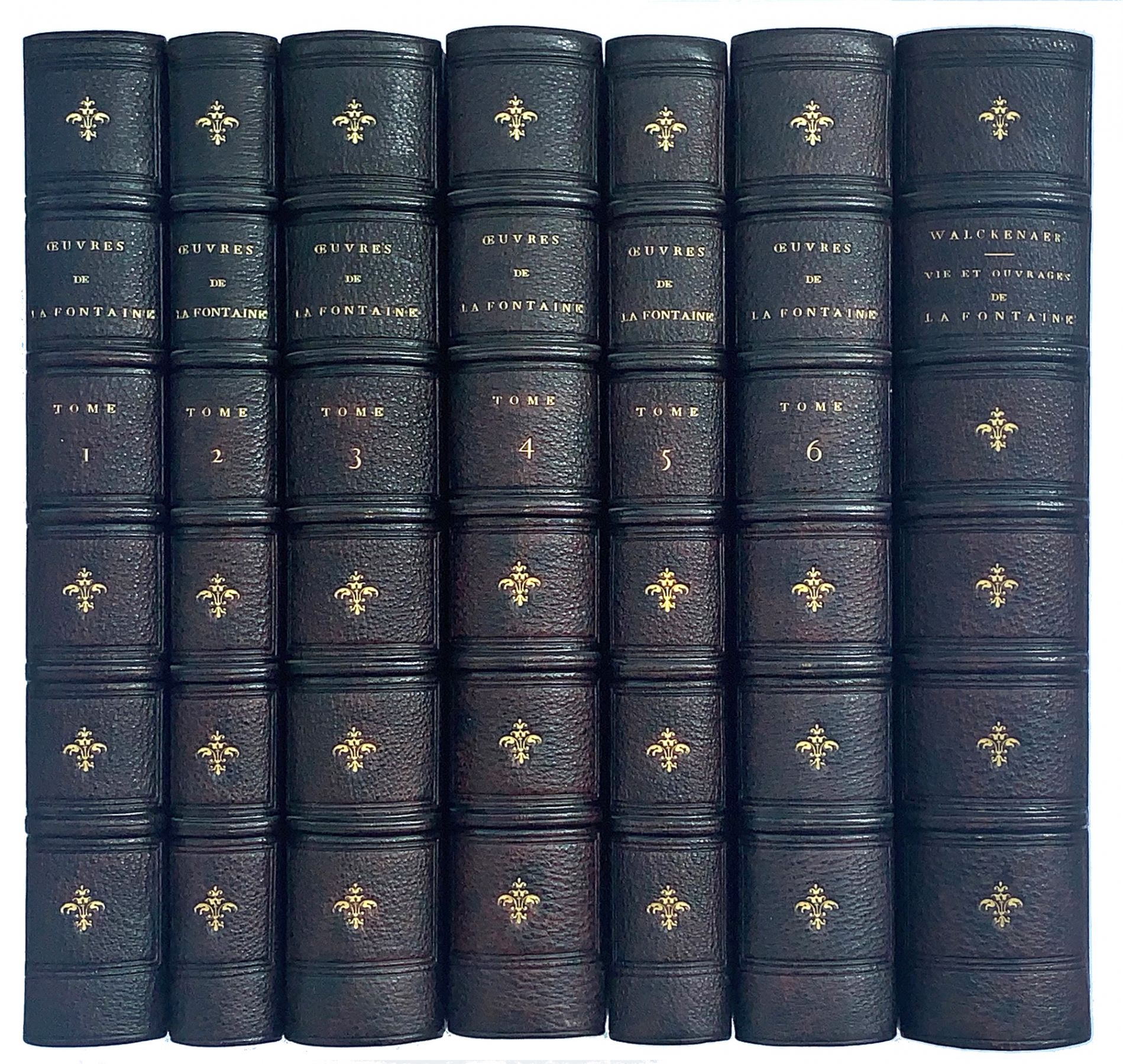 LA FONTAINE Jean de. Oeuvres. Nouvelle édition,revue, mise en ordre, et accompagnée de notes, par C.-A. Walckenaer. Paris, chez Lefèvre, 1826-1827. Six volumes in-8 [231 x 142 mm], demi-maroquin aubergine à gros grain, dos à nerfs ornés, têtes dorées (Reliure de l’époque). Deux portraits de l’auteur par Hopwood et Roger, 12 fines gravures de Tony Johannot et de 11 planches montées de Percier et Berteaux, gravées par Duparc, Massard, Revel, Devilliers, Morizot, etc. Joint: WALCKENAER C.-A. Histoire de la vie et des ouvrages de Jean De La Fontaine. Troisième édition, corrigée, augmentée et ornée de gravures. Paris, chez A. Nepveau et chez L. De Bure, 1824. Un volume in-8 [231 x 142 mm], demi-maroquin aubergine à gros grain, dos à nerfs ornés, tête dorée (Reliure de l’époque). Bel exemplaire.