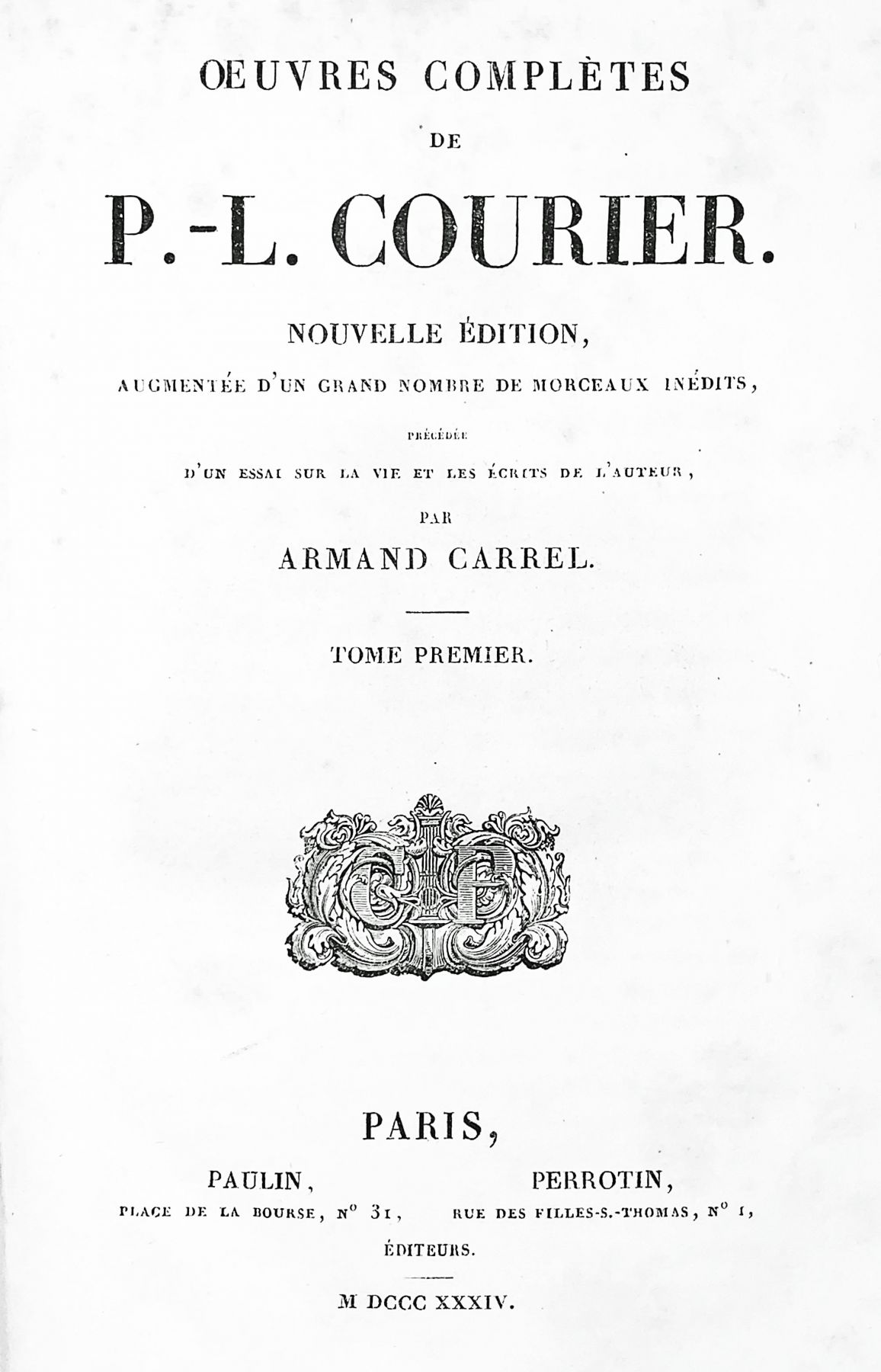COURIER Paul-Louis. Oeuvres complètes. Nouvelle édition augmentée d’un grand nombre de morceaux inédits et précédée d’un essai sur sa vie et les écrits de l’auteur par Armand Carrel. Paris, Paulin & Perrotin, 1834, 4 volumes in-8, demi-veau brun.