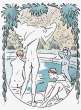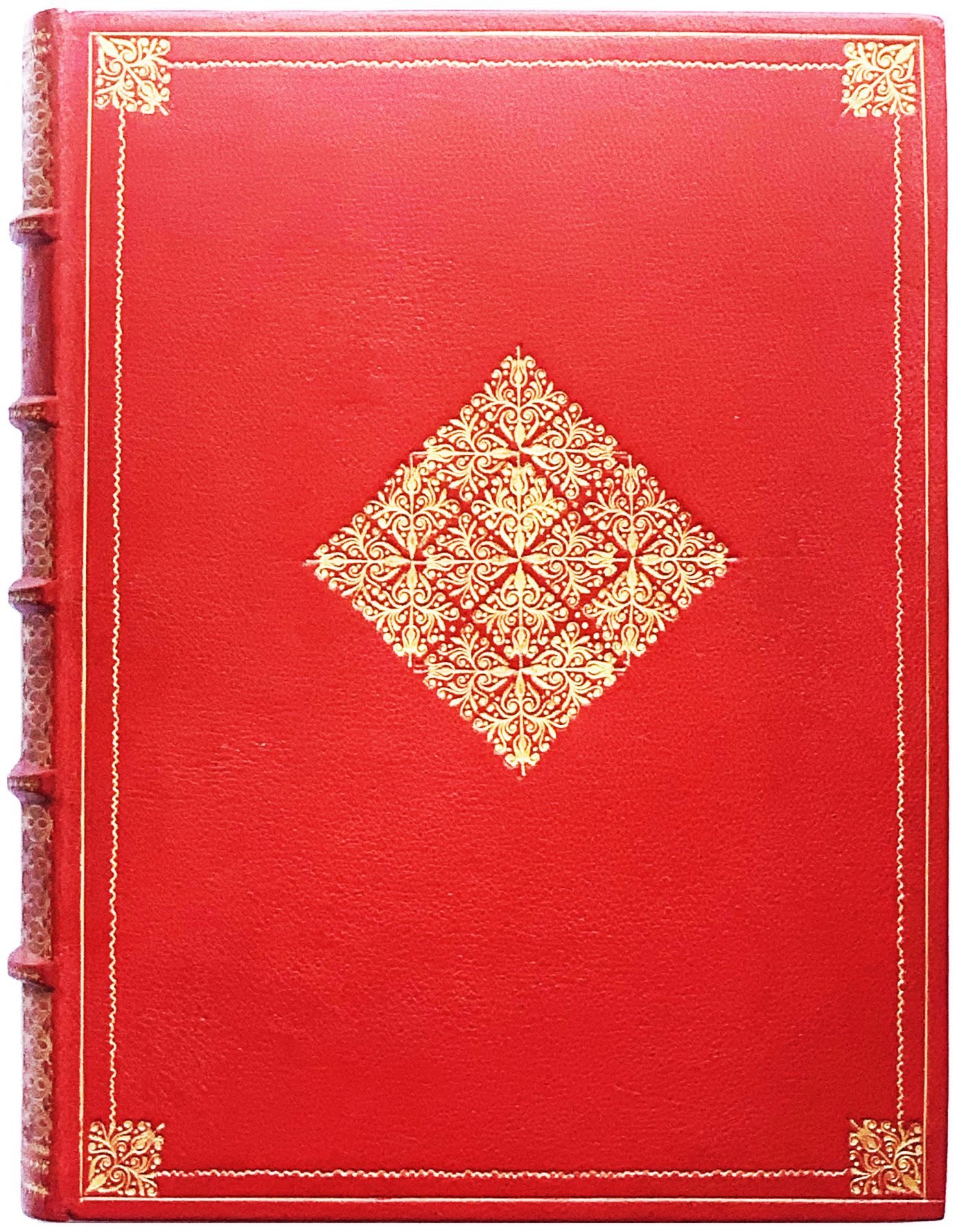 BOYLESVE René. La Leçon [et les Nouvelles Leçons] d’Amour dans un parc. Paris, Mornay, 1929-1930. Deux volumes in-8 [197 x 146 mm], chagrin orange, dos à nerfs ornés, double encadrement avec fleurettes d’angles dorées et rosace centrale dorée, étui. Cent illustrations de Carlègle, coloriées au pochoir. Tiré à 1000 exemplaires, celui-ci l’un des 50 sur Montval avec une suite de 8 compositions en noir. Charmants exemplaires très bien reliés.