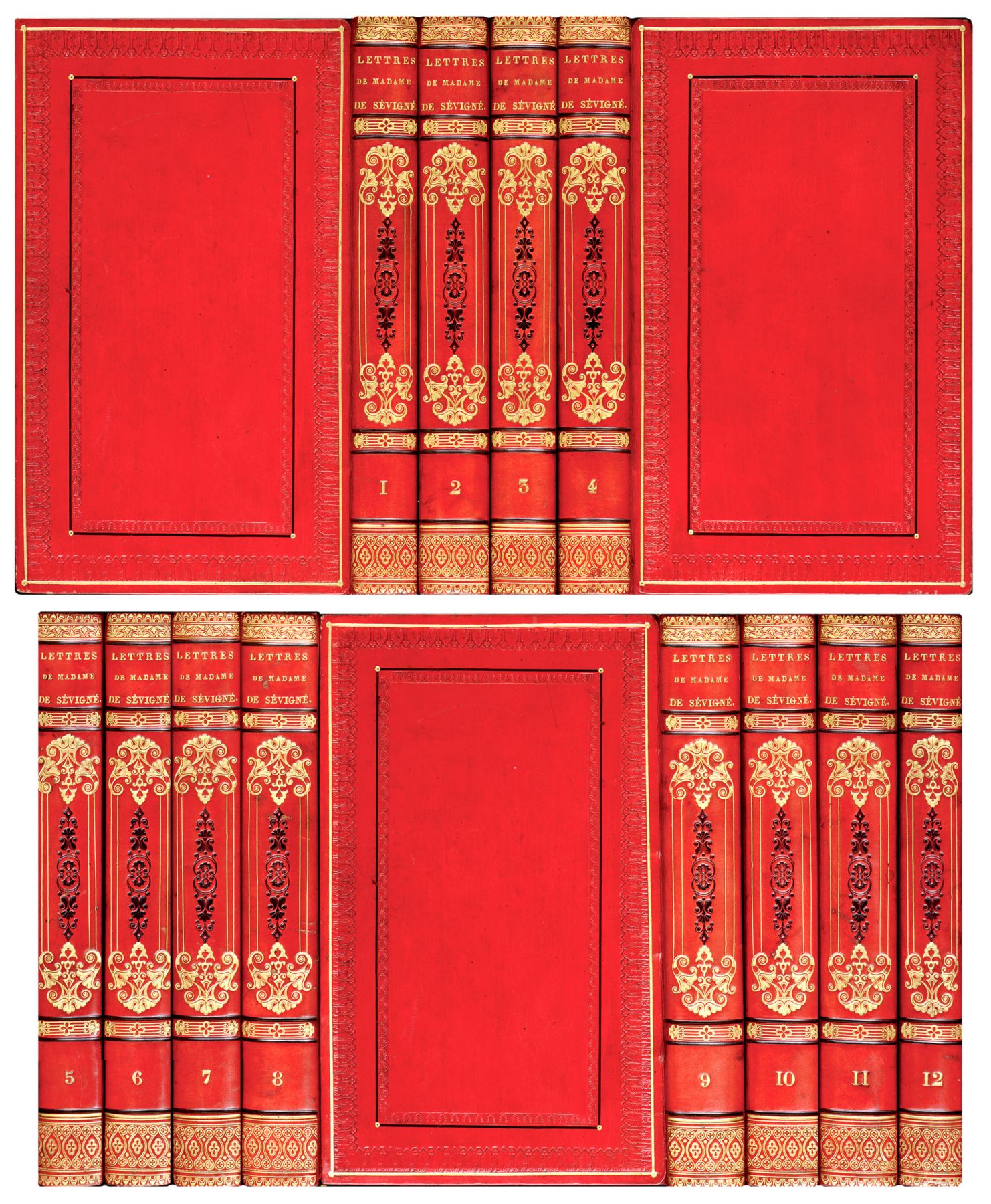 SÉVIGNÉ Marquise de. Lettres de Madame de Sévigné, de sa famille et de ses amis. Nouvelle édition, précédée d’un essai biographique et littéraire, et ornée de deux portraits. Paris, Janet et Cotelle, 1822-1823. 12 volumes in-8 [207 x 126 mm], veau rose vif, encadrement d’une roulette de palmettes à froid et filet doré, et d’un second encadrement d’un filet noir clouté d’or aux angles et d’une roulette à froid différente de la première, dos lisse richement orné or et à froid en long à la romantique, tranches marbrées vertes (Reliure de l’époque).