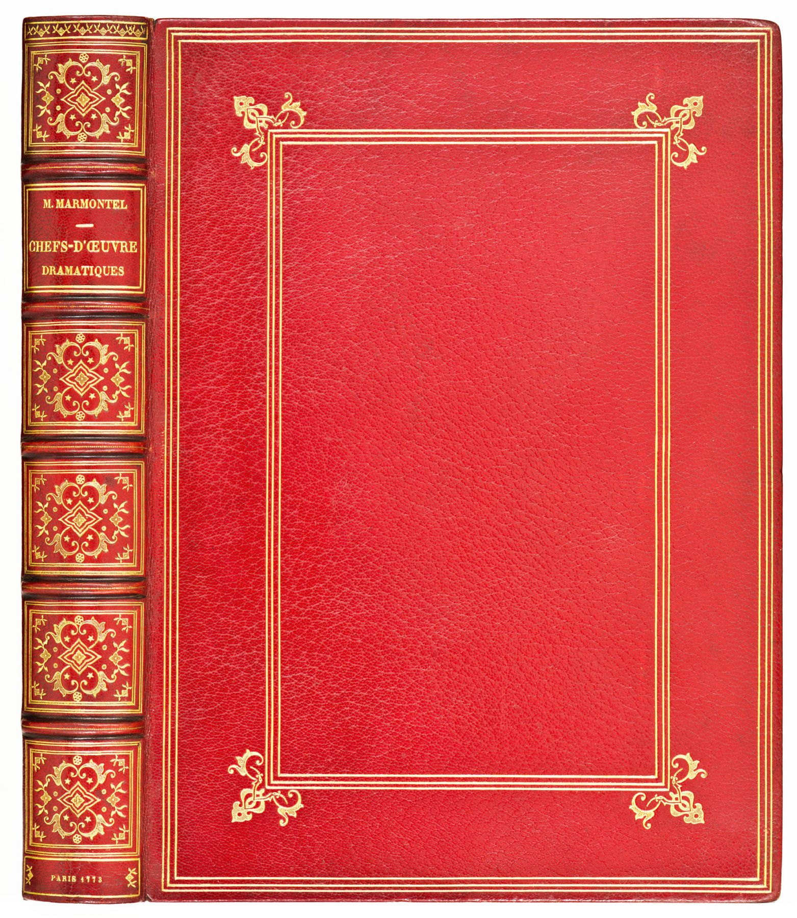 MARMONTEL Jean-François. Chefs-d’œuvre dramatiques. Recueil des meilleures pièces du Théâtre françois, Tragique, ... dédié à Mme la Dauphine. Paris, Chez Grangé, 1773. In-4 [281 x 203 mm], maroquin rouge, dos à cinq nerfs richement orné, encadrement des plats à la Du Seuil, double filet sur les coupes, large dentelle dorée intérieure, tranches dorées sur marbrures, double gardes (Louis Pouillet).