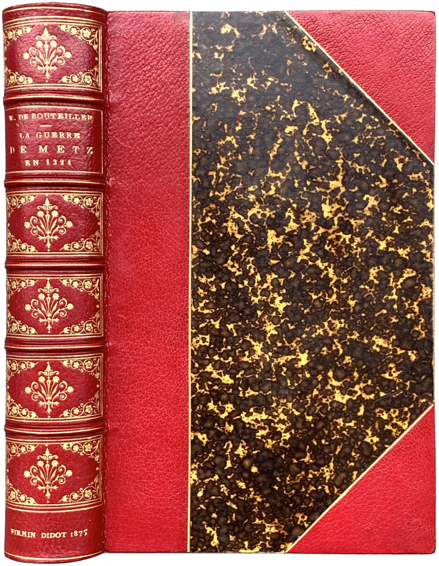 BOUTEILLER Ernest de - GAUTIER Léon - BONNARDOT F. La Guerre de Metz en 1324. Poème du XIVe Siècle publié par E. de Bouteiller, Ancien Député de Metz, suivi d'Etudes critiques sur le texte par F. Bonnardot et précédé d'une préface par Léon Gautier. Paris, Librairie Firmin-Didot et Cie, Imprimeurs-Libraires de l'Institut, 1875, 1 volume in-8 [222 x 137 mm] environ, xxv-509 pages, demi-maroquin rouge à coins, dos à nerfs portant titres dorés, orné de caissons à fleurons et motifs dorés, tête dorée, gardes marbrées. Texte orné de lettrines bandeaux et culs-de-lampe, avec 5 hors texte sous serpentes dont 2 doubles-pages. Ernest de Bouteiller (1826-1883) - Léon Gautier (1832-1897).
