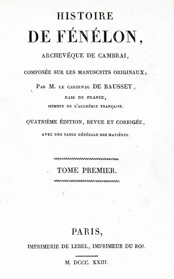 BAUSSET Cardinal de. Histoire de Fénélon, archevêque de Cambrai composée sur les manuscrits originaux par M. le Cardinal de Bausset. Paris, Imprimerie de Lebel imprimeur du Roi, 1823, 4 volumes in-12, en reliure plein veau raciné de l'époque.