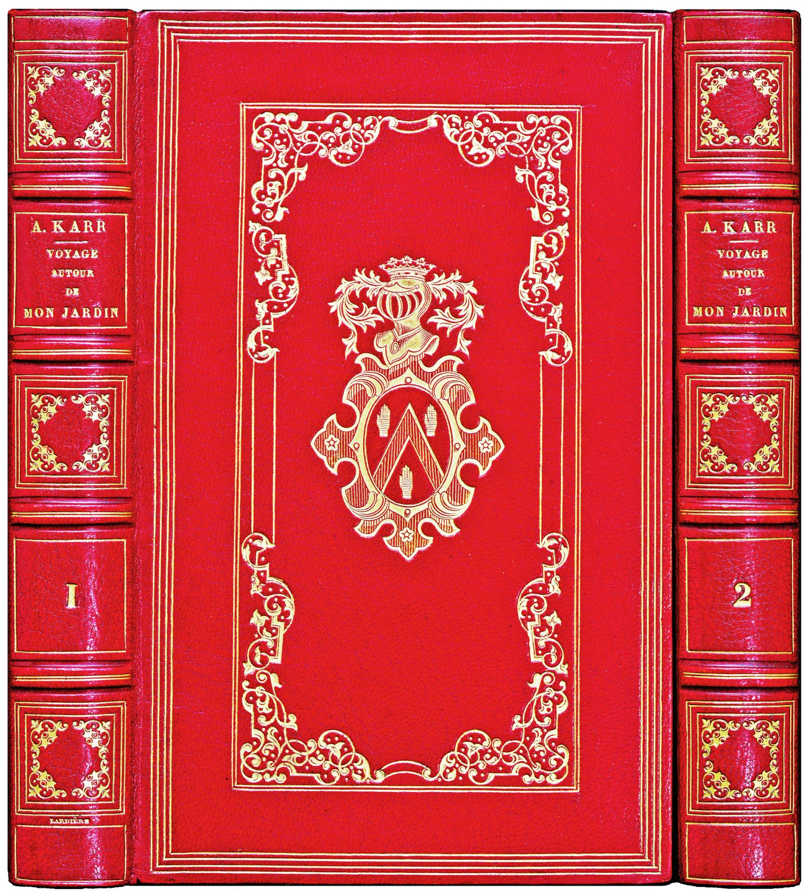 KARR Alphonse. Voyage autour de mon jardin. Avec une table alphabétique des noms d’animaux, de plantes et de noms propres cités. Paris, Dumont, 1845. 2 volumes in-8 [206 x 126 mm], maroquin rouge, quatre filets dorés encadrant les plats au centre desquels on trouve les armes de Curmer Neilson se trouvant elle-même dans un double cadre doré et décoré, dos à nerfs orné d’encadrements de filets et fleurons dorés, intérieure décoré de filets dorés, filets dorés sur les coupes, tranches dorées (Lardière *). Ouvrage illustré d’un portrait rehaussé à l’aquarelle avec cette mention manuscrite : «ceci est le portrait de Villemain, auteur de L’Herbier pratique». Il est illustré de 33 et 27 planches, gravées sur acier hors texte, monté sur chine ou imprimé représentant des vues (caractéristiques de style romantique), des oiseaux, des papillons ou des insectes, très nombreuses vignettes dans le texte, sur chine monté ou imprimées, le tout par divers artistes.