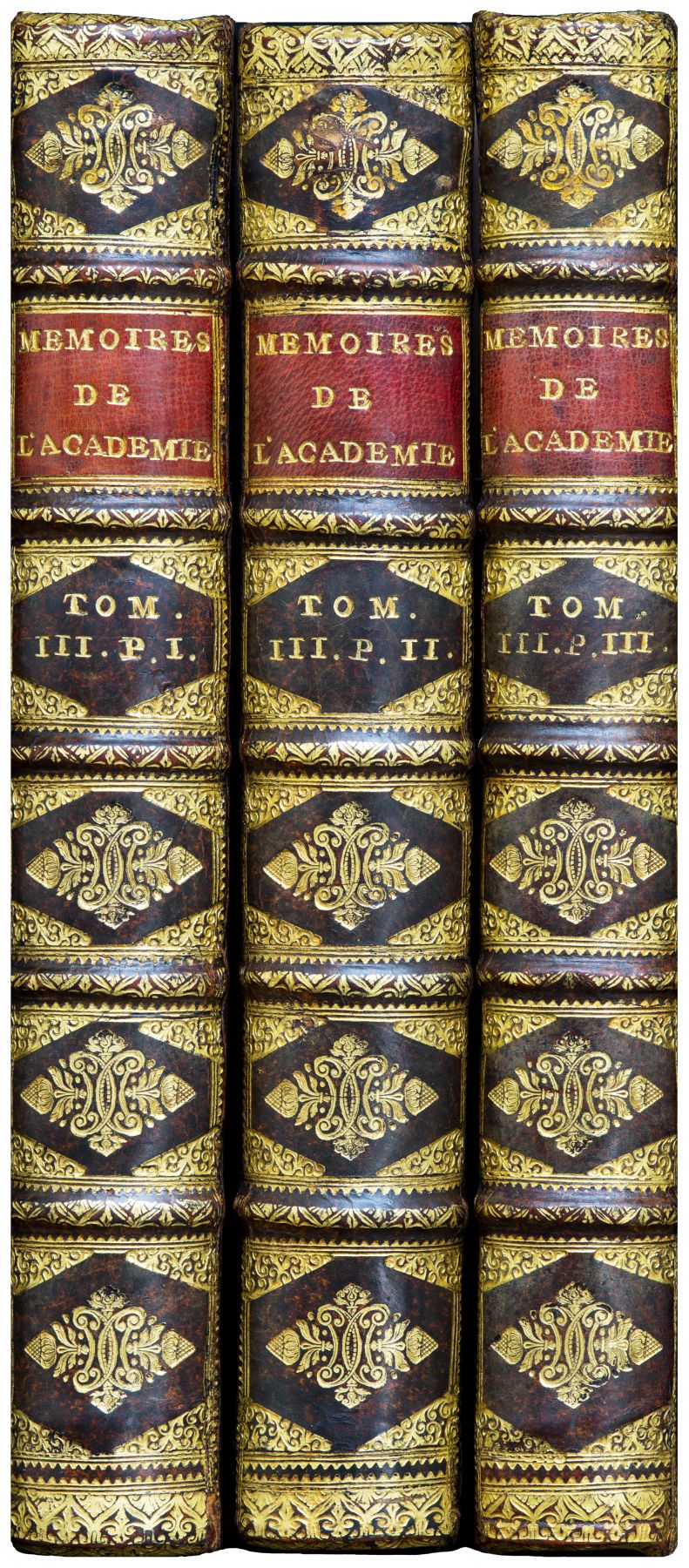 [ZOOLOGIE] - MEMOIRES DE L’ACADEMIE ROYALE DES SCIENCES. Depuis 1666. jusqu’à 1699. Tome III. Memoires pour servir a l'histoire naturelle des animaux. Dressé par Perrault Claude (1613-1688), de l’Académie Royale des Sciences. & Medecin de la Faculté de Paris. A Paris, par la Compagnie des libraires, 1733-1734. 3 parties en 3 volumes in-4 [255 x 185 mm], veau moucheté, dos à cinq nerfs richement ornés et dorés, pièces de titres en veau brique, coupes décorées, tranches mouchetées (Reliure de l’époque).