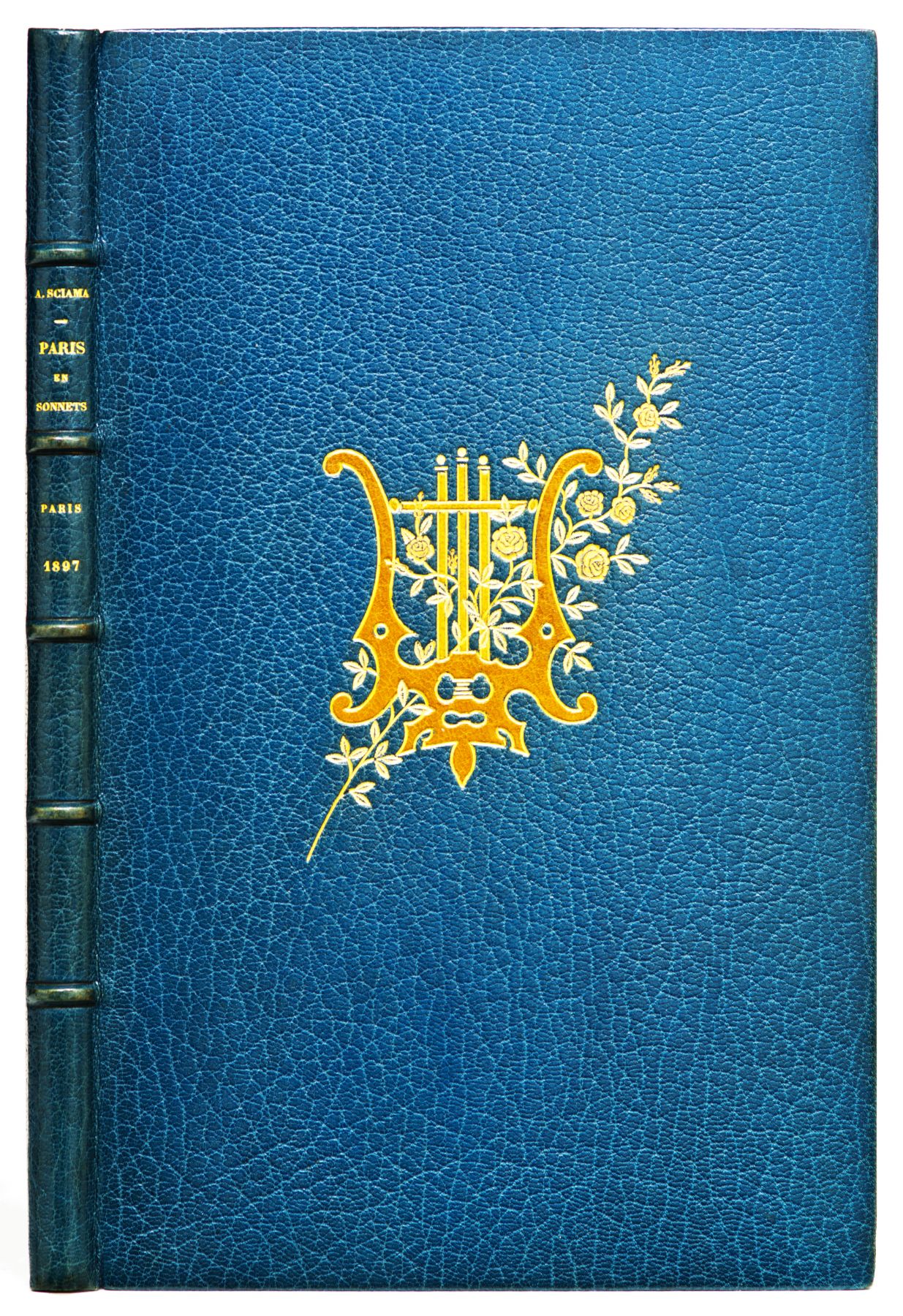 [PARIS] SCIAMA André [André-Semiane]. Paris en Sonnets. Paris, L. Conquet, 1897. Grand in-80 [237 x 146 mm], maroquin bleu indigo, au centre des plats lyre mosaïquée de maroquin havane et citron et branche de rosier entrelacée dorée à l’or jaune et rose, encadrement intérieur serti d’un filet doré, doublure de maroquin saumon orné de feuilles de marronnier et marrons mosaïqués de maroquin vert foncé et vert tendre, gardes de soie brochée moirée dans les tons vert et rose, doubles gardes, double filet sur les coupes, tranches dorées sur témoins, couvertures, chemise demi-maroquin bleu, étui bordé (Adolphe Cuzin).