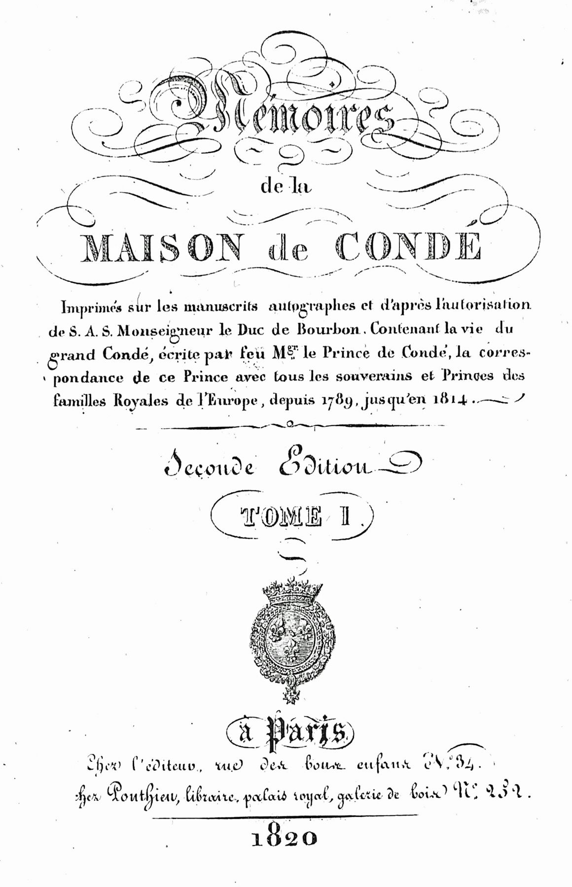 «Mémoires historiques rédigés par le Cte. L. de Sévelinges, secrétaire du prince de Condé. Ils étaient destinés à justifier les actes de ce prince pendant la Révolution, et sont précédés d’une Vie du Grand Condé qui forme le tome I.» (Saffroy).