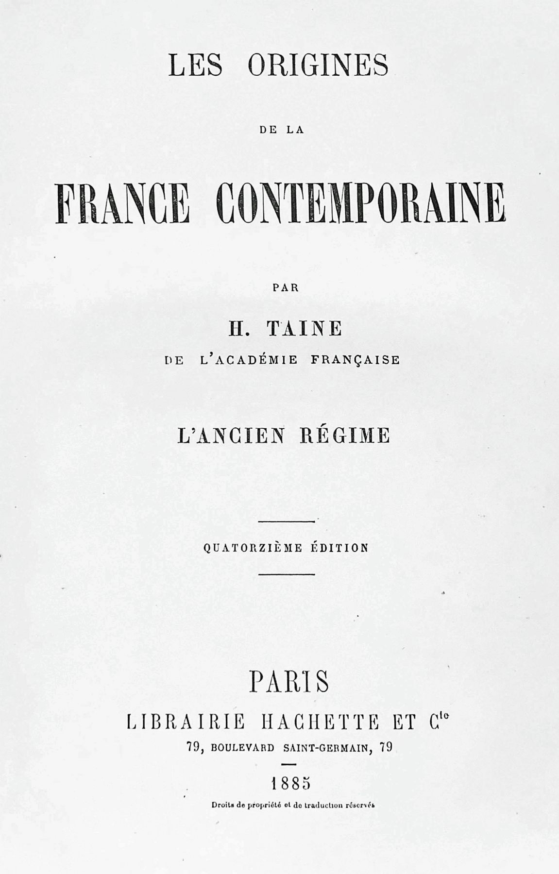 TAINE H. [Hippolyte Adolphe]. Les Origines de la France contemporaine. Paris, Hachette, 1884-1894; 6 volumes in-8, demi-chagrin brun à coins, dos lisse orné, tranche rouge. (Reliure de l’époque)
