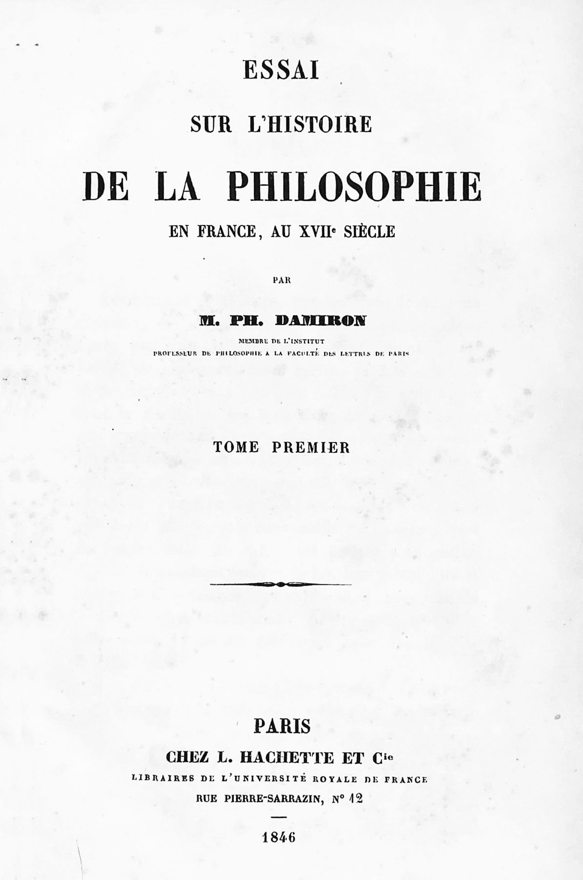 DAMIRON Jean-Philibert. Essais sur l’Histoire de la philosophie en france au XVIIme & au XIXme siècles. Paris, Ponthieu, Hachette, 1828- 1846; 3 volumes in-8, demi-veau bleu et demi-chagrin rouge dos à nerfs orné (Reliure de l’époque).