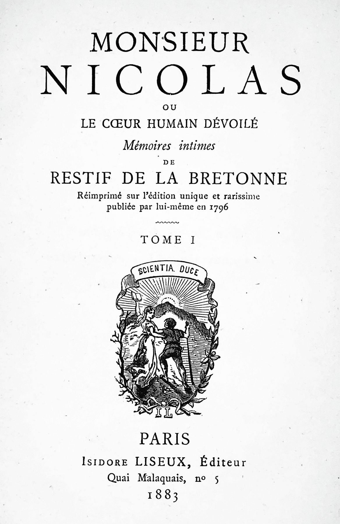 RESTIF DE LA BRETONNE Nicolas-Edme. Monsieur Nicolas, ou le Cœur humain dévoilé. Paris, Isidore Liseux, 1883; 14 volumes in-8, reliure à la Bradel toile bordeaux de l’époque, dos lisses ornés, pièces de titre et tomaison en maroquin noir, les deux plats de couvertures conservés, non rogné.