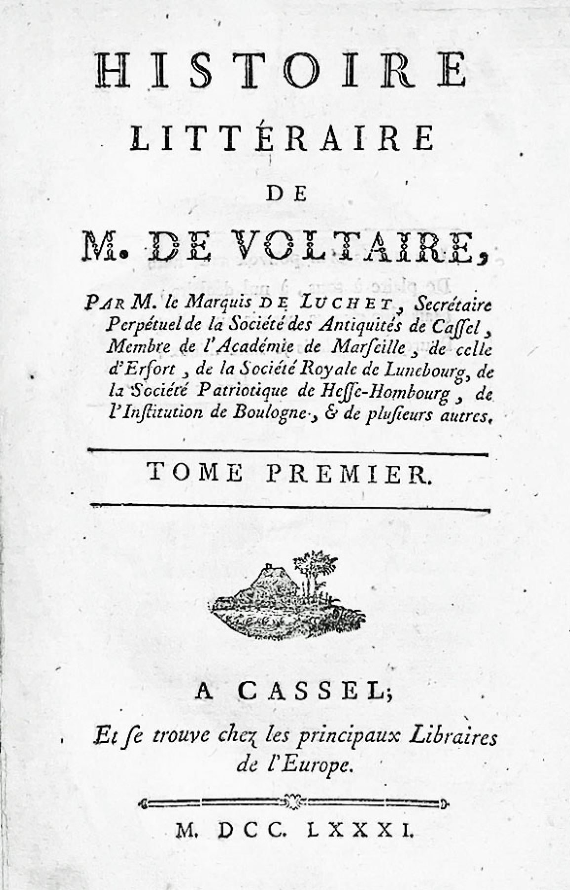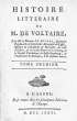 LUCHET Jean Pierre Louis de La Roche du Maine, Marquis de. Histoire littéraire de m. de Voltaire. A Cassel et se trouve chez les principaux libraires de l'Europe, Paul Barde, 1781; 6 volumes in-8, broché.