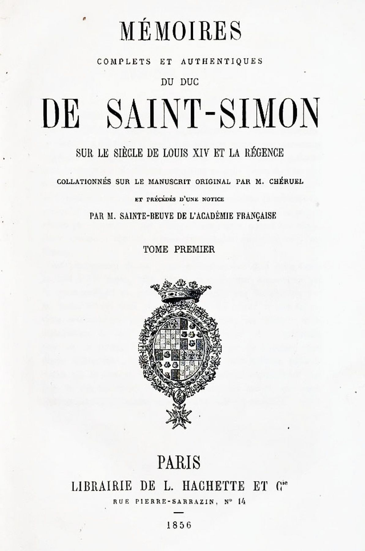 SAINT-SIMON Louis de Rouvroy, duc de. Mémoires complets et authentiques sur le règne de Louis XIV et la Régence, collationnés sur le manuscrit original par M. Chéruel et précédés d’une notice par M. Sainte-Beuve. Paris, Hachette, 1856-1858; 20 volumes in-8, demi-chagrin noir de l’époque, dos à faux-nerfs, titre et tomaisons dorés.
