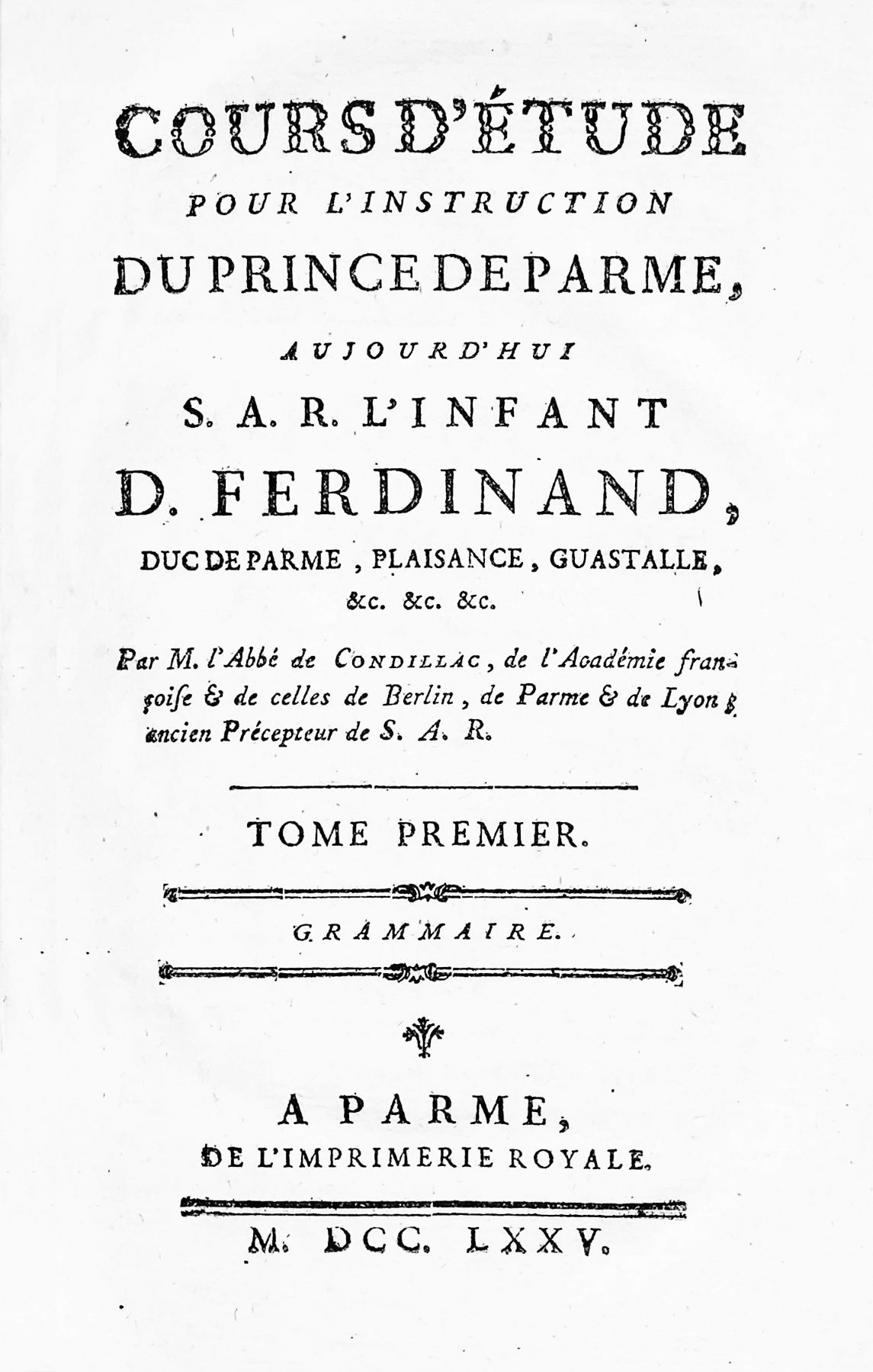 CONDILLAC Etienne Bonnot de. Cours d’étude pour l’instruction du Prince de Parme, aujourd’hui S.A.R. l’Infant D. Ferdinand, Duc de Parme, Plasance, Guastalle, &. &. &. Parme, de l’Imprimerie Royale,1775; 16 vol. in-8, plein veau de l’époque. Intérieur propre sans rousseurs et accompagné de 9 plans dépliants. Reliure défraîchie et coins émoussés