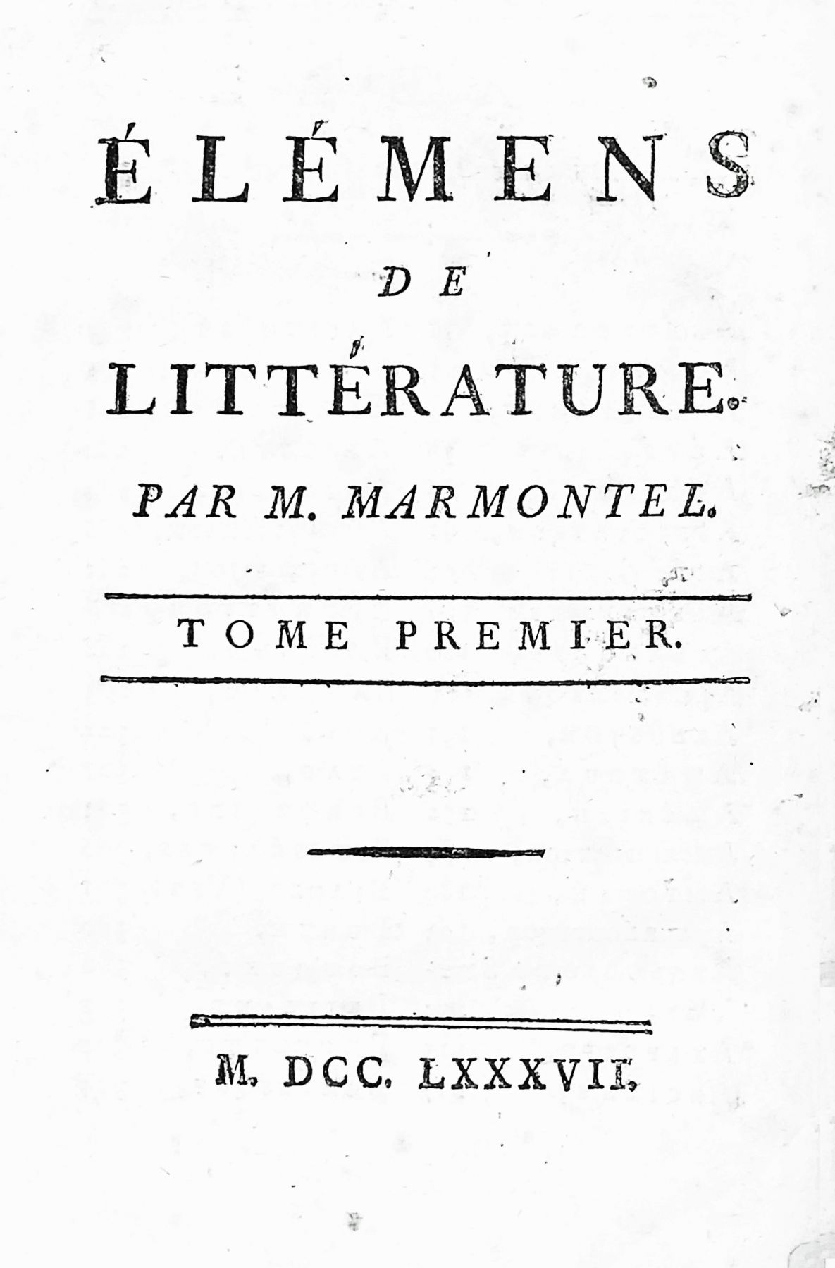 MARMONTEL Jean-François. Elements de littérature. Paris, s.i.[ Née de La Rochelle].,1787; 6 volumes in-12, demi-veau brun de l’époque. Cet ouvrage, publié en 1787 par le secrétaire perpétuel de l'Académie française, constitue une somme en matière de réflexion esthétique et littéraire. Construit comme un dictionnaire, il propose 192 entrées thématiques sur les catégories essentielles de l'analyse littéraire, depuis "abondance" jusqu'à "vraisemblance", et permet de mieux lire et comprendre la production littéraire du XVIIIe siècle.