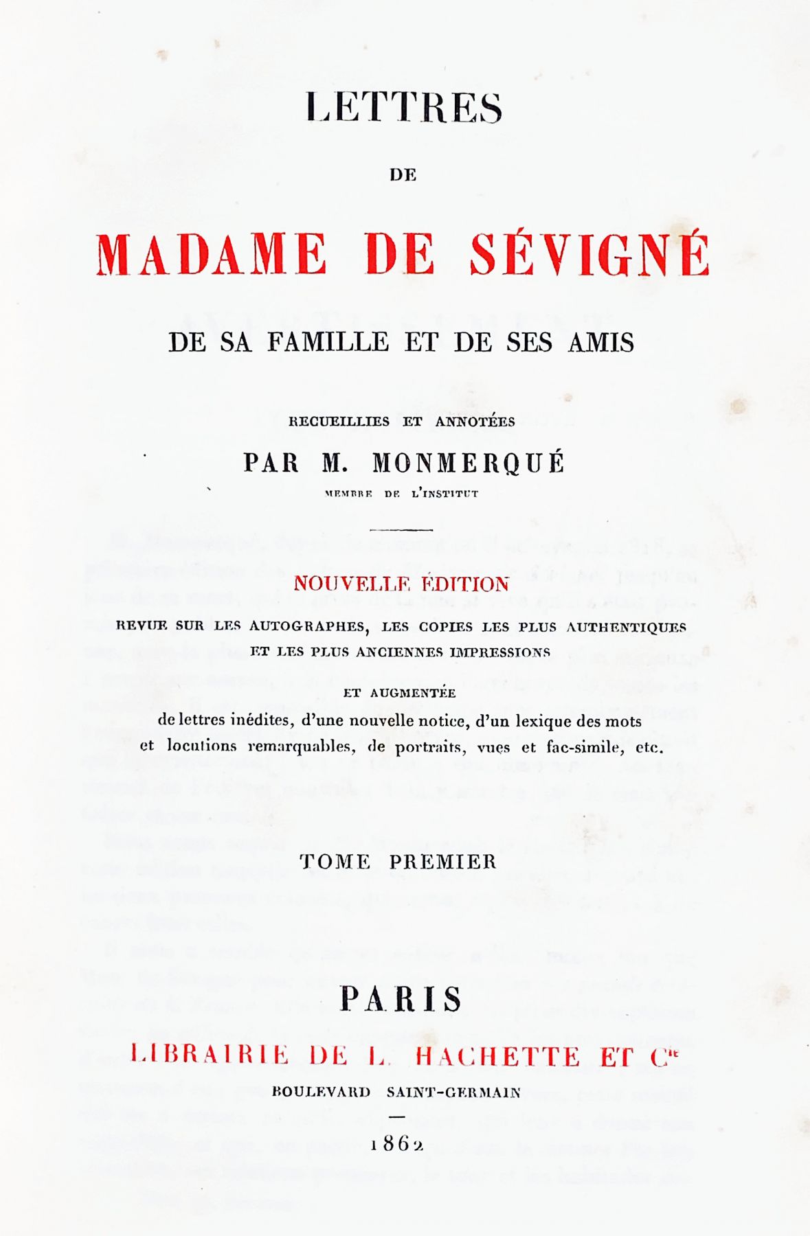 SEVIGNE Marie de Rabutin-Chantal, Marquise de. Lettres, puis: Lettres inédites. De sa famille et de ses amis. Recueillies et annotées par M. Monmerqué.Nouvelle édition revue sur les autographes, les copies les plus authentiques et les plus anciennes impressions et augmentée de lettres inédites, d’une nouvelle notice, d’un lexique des mots et locutions remarquables, etc. Paris, Hachette, 1862-1876; 16 volumes in-8, demi-chagrin brun. Sans album. Rousseurs.
