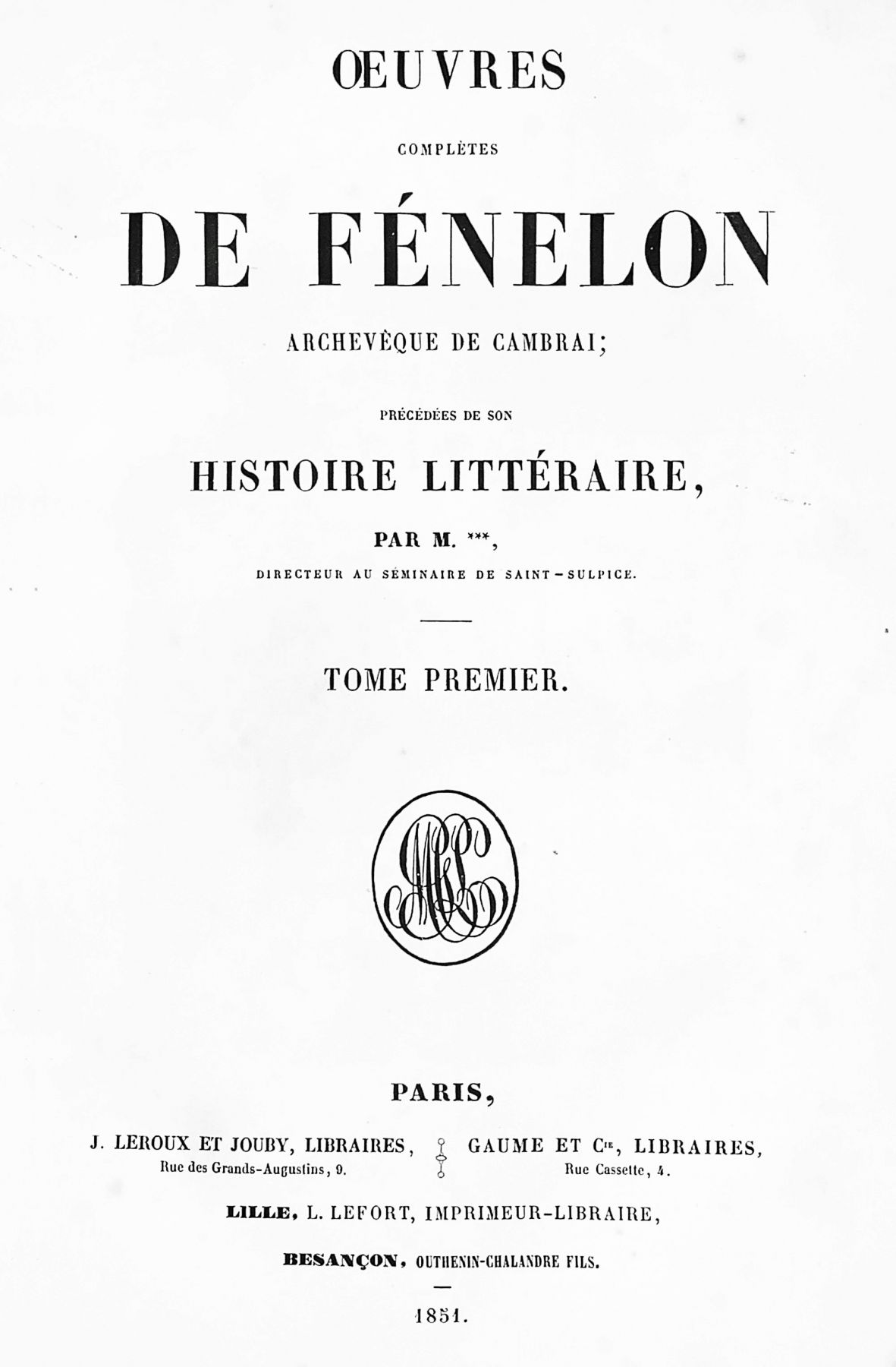 FENELON François de Salignac de la Mothe. Œuvres complètes. Précédées de son histoire littéraire par M. Gosselin. Paris, Leroux-Jouby et Gaume, 1851-1852; 10 vol. in-4, demi-chagrin brun, dos à nerfs orné. Illustré d'un portrait de Fenélon en frontispice, 1 planche hors-texte et de 14 fac-similés de lettres hors-texte. Légères rousseurs. Bel exemplaire.
