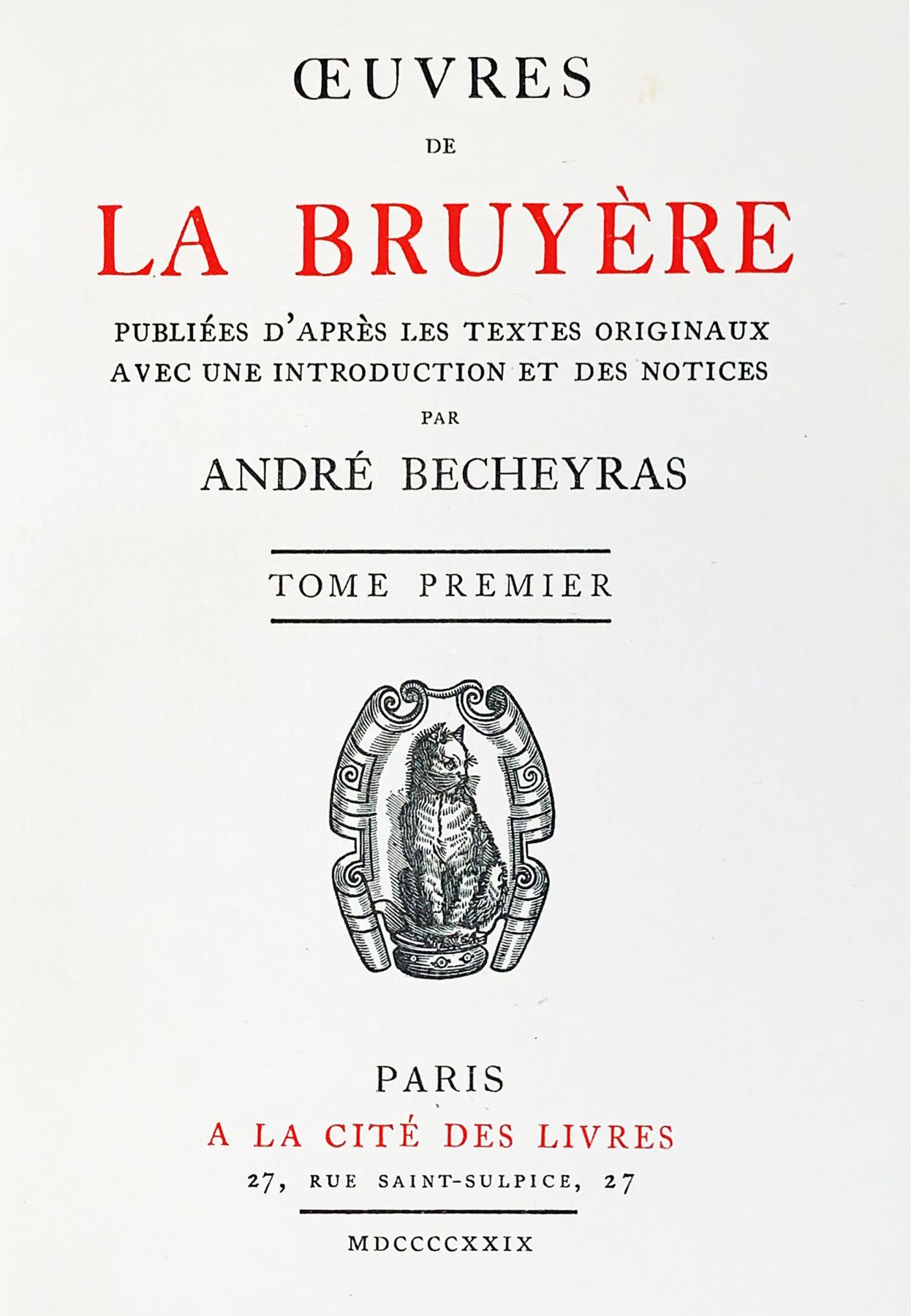 LA BRUYERE Jean de. Œuvres. Publiées d’après les textes originaux avec une introduction et des notices par André Becheyras. Paris, Cité des Livres, 1929; 2 volumes in-8,brochés sous couvertures rempliées. Très belle édition à l'impression soignée. L’un des exemplaires numérotés sur vergé a la forme des papeteries d’Arches