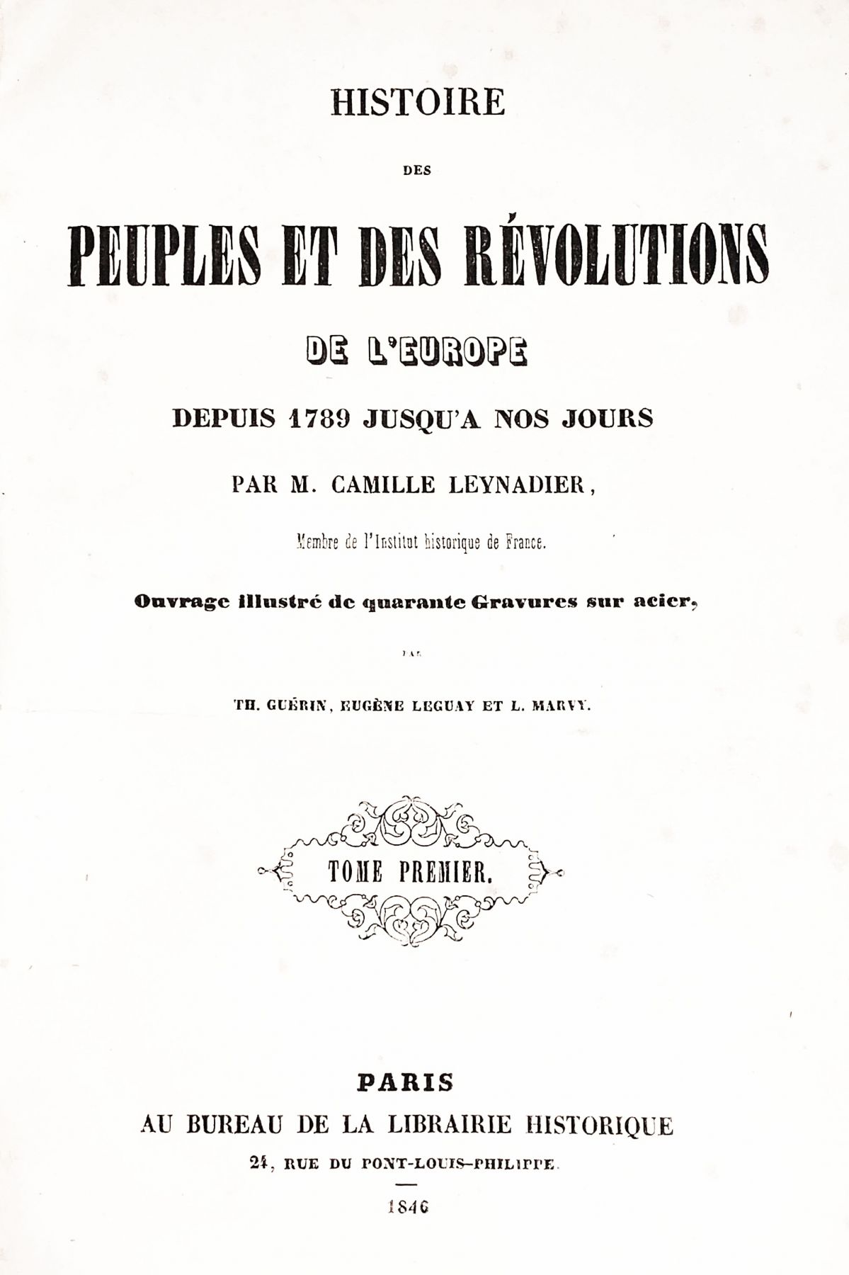 LEYNADIER Camille. Histoire des peuples et des révolutions de l’Europe depuis 1789 jusqu’à nos jours. Paris, Bureau de la Librairie historique, 1846-1848, 8 volume s in-8, demi-veau brun, dos à nerfs. Ouvrage illustré de quarante gravures sur acier par Th. Guérin, Eugène Leguay et L. Marvy. Rousseurs.