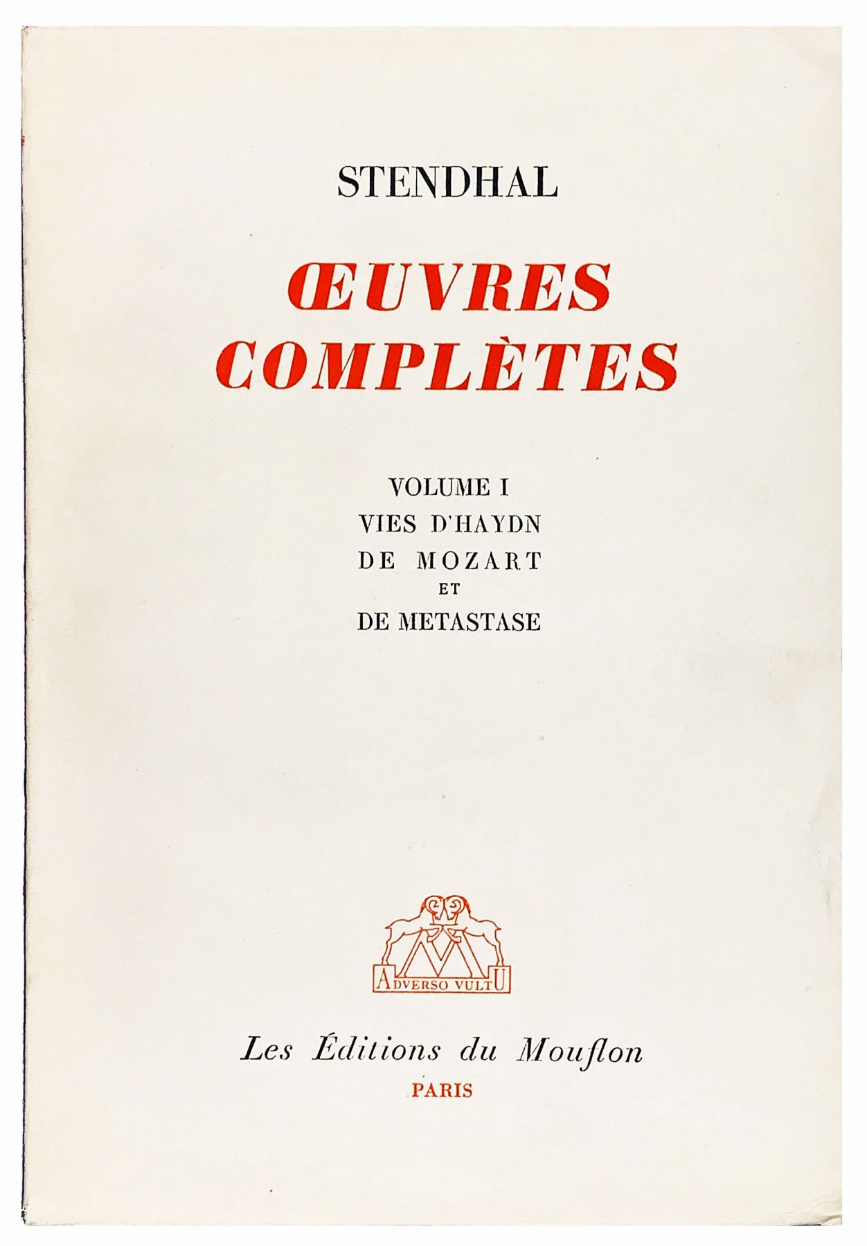 STENDHAL Henri BEYLE, dit. Œuvres complètes. Préface de l'éditeur. Notice Biographique d'Henri Beyle par Romain Collomb. Paris, Pierre Larrive, 1951-1955; 25 volumes in-4, brochures originales, rempliées. Texte établi par Georges Eudes. Détail des volumes. - Tome 1, Vies d'Haydn, de Mozart et de Métastase. - 2, Vie de Rossini, Notes d'un dilettante. - 3, Histoire de la Peinture en Italie. - 4, Rome, Naples et Florence. - 5 et 6, Promenades dans Rome tome premier et second. - 7et 8, Mémoires d'un Touriste tome premier et second. - 9 , Armance , Romans et Nouvelles. - 10, Le Rouge et le Noir. - 11, L'Abbesse de Castro, Chroniques Italiennes. - 12, La Chartreuse de Parme. - 13 et 14, Lucien Leuwen tome premier et second. - 15, De l'Amour. - 16, Racine et Shakespeare. - 17, Napoléon. - 18, Vie de Henri Brulard. - 19, Souvenirs d'égotisme. - 20, 21, 22, Journal 1 (1801-1805) et 2. - 23, 24, 25 , Correspondance tomes 1, 2 , 3.